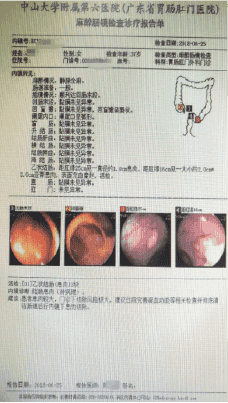 谢女士一直以来工作比较忙,经常饮食不规律。在十余年前开始就有胃肠功能紊乱症状,谢女士自述多年来左下腹有间断性钝痛感,期间有服用过一些肠胃药,但隔一段时间又会再次发作,近来疼痛感加重到院就诊。医生让谢女士做了粪便DNA检测,结果【阳性】。经医疗人员随访,谢女士在三周后到院做了肠镜检查。
