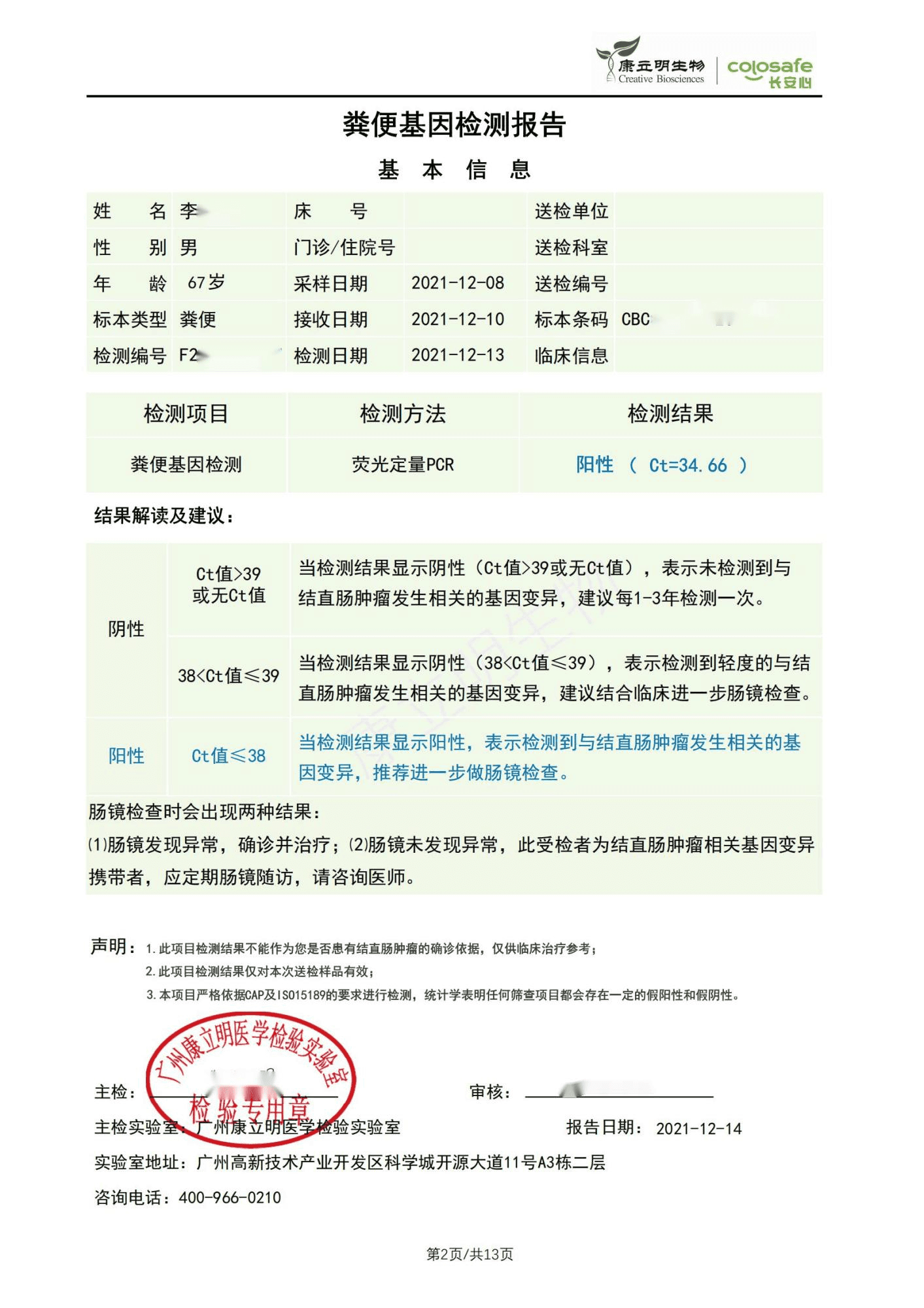 检测时间:2021年12月10日结果:阳性(+);CT值:34.66