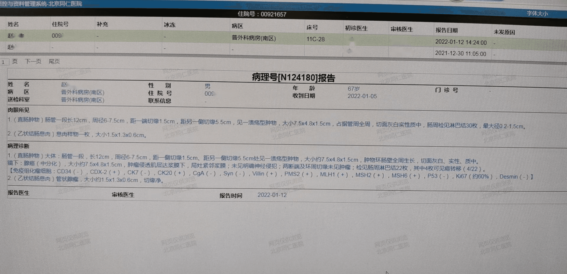 1、(直肠肿物)大体:肠管一段,长12cm,周径6-7.5cm,距另一侧切缘5.5cm处见一溃疡型肿物,大小约7.5*4.8*1.5cm,肿物环肠壁全周生长,切面灰白实性、质中。镜下:腺癌(中分化),大小约7.5*4.8*1.5cm,肿瘤侵透肌层达浆膜下,局灶紧邻浆膜;未见明确神经侵犯;两断端及环周切缘未见肿瘤,检见肠周淋巴结22枚,其中4枚可见癌转移(4/22)。