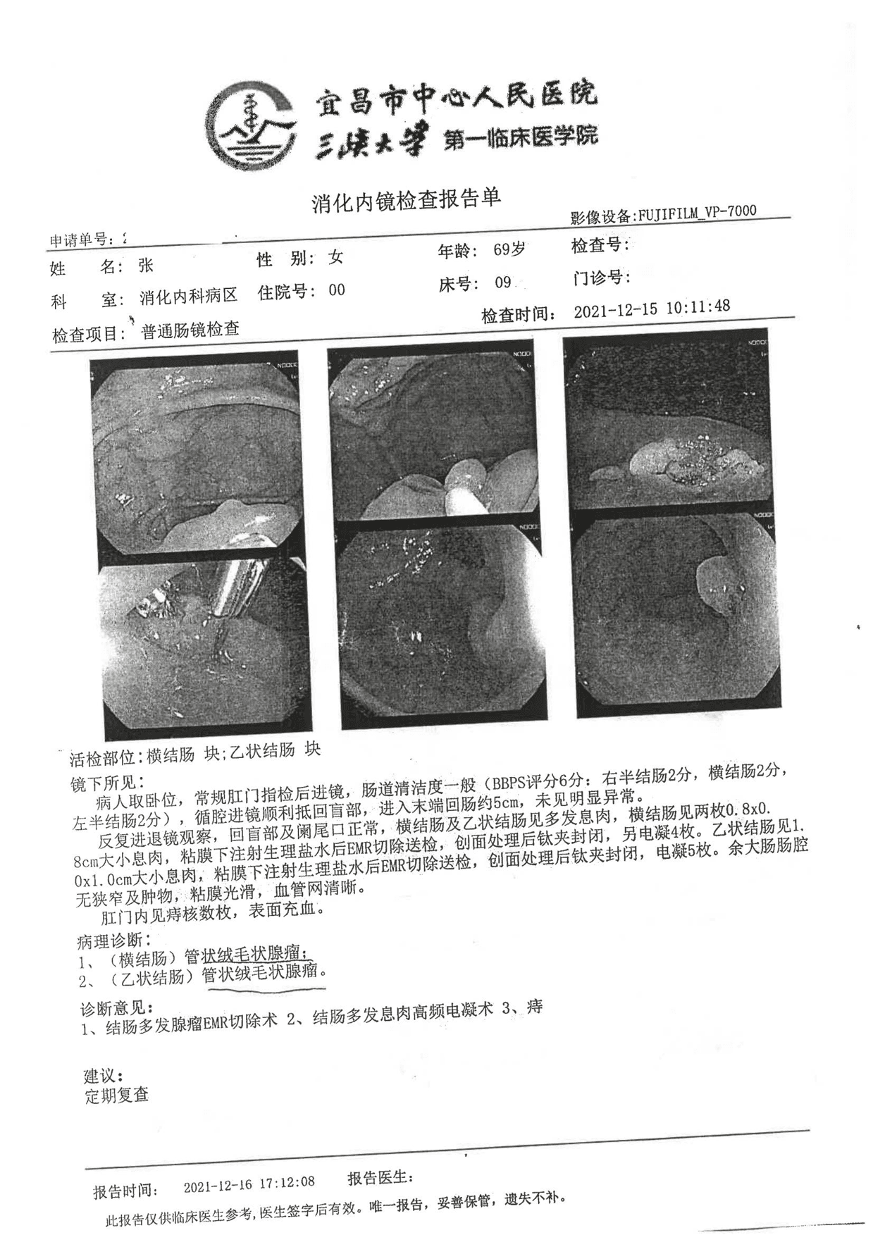镜下所见:横结肠及乙状结肠见多发息肉,横结肠见两枚0.8*0.8cm大小息肉,粘膜下注射生理盐水后EMR切除送检,创面处理后钛夹封闭,另电凝4枚。乙状结肠见1.0*1.0cm大小息肉,粘膜下注射生理盐水后EMR切除送检,创面处理后钛夹封闭,电凝5枚。肛门内见痔核数枚,表面充血。