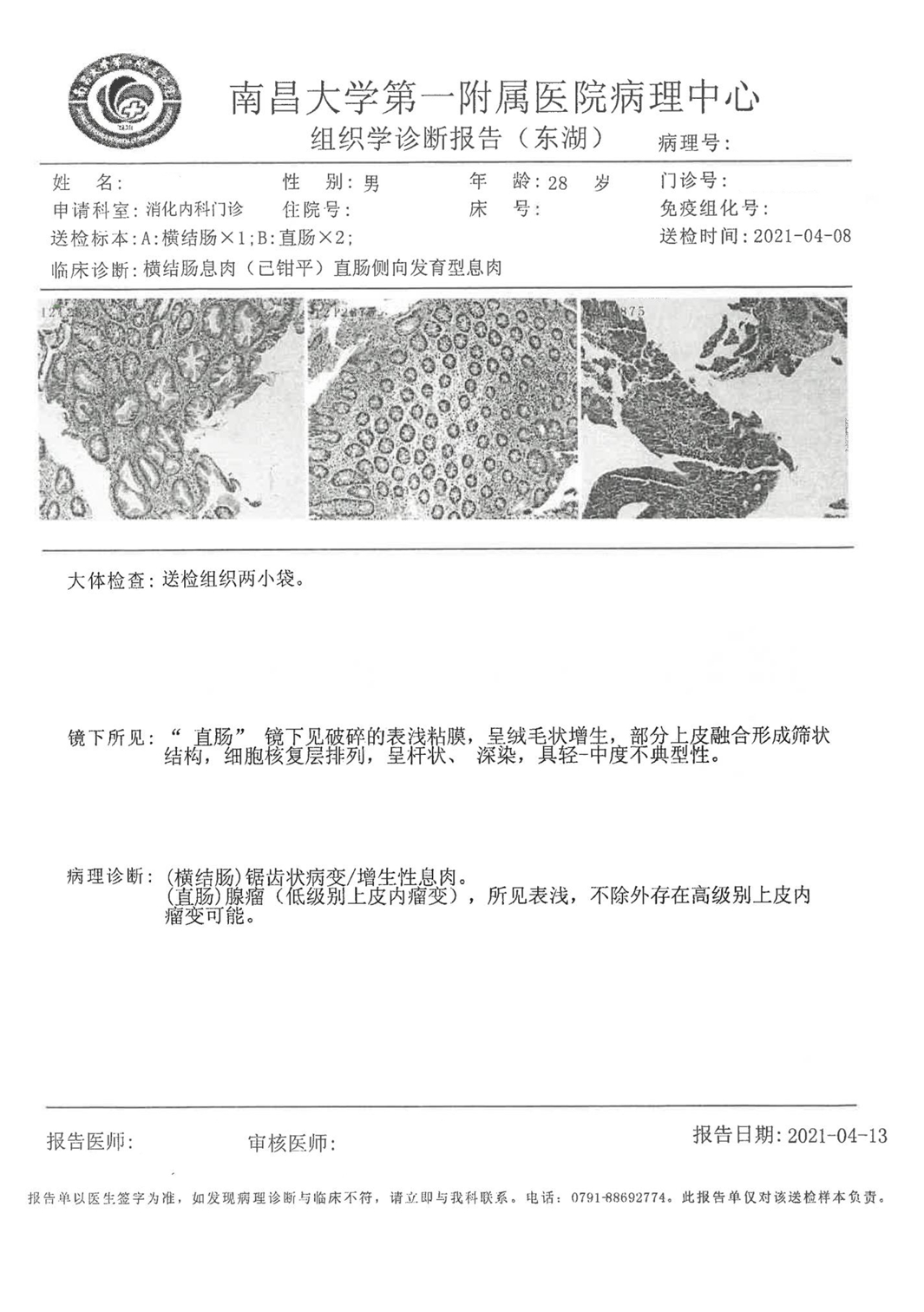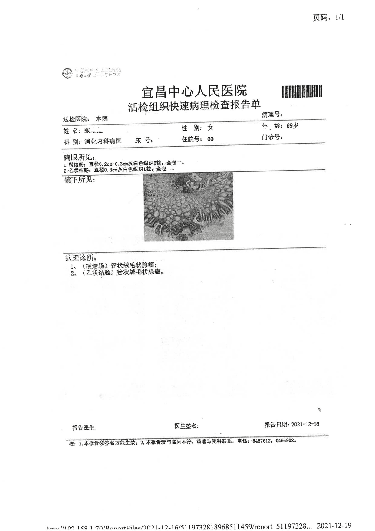 2、(横结肠)绒毛状-管状腺瘤,伴局灶高级别上皮内瘤变;蒂部切缘未见异型增生细胞。