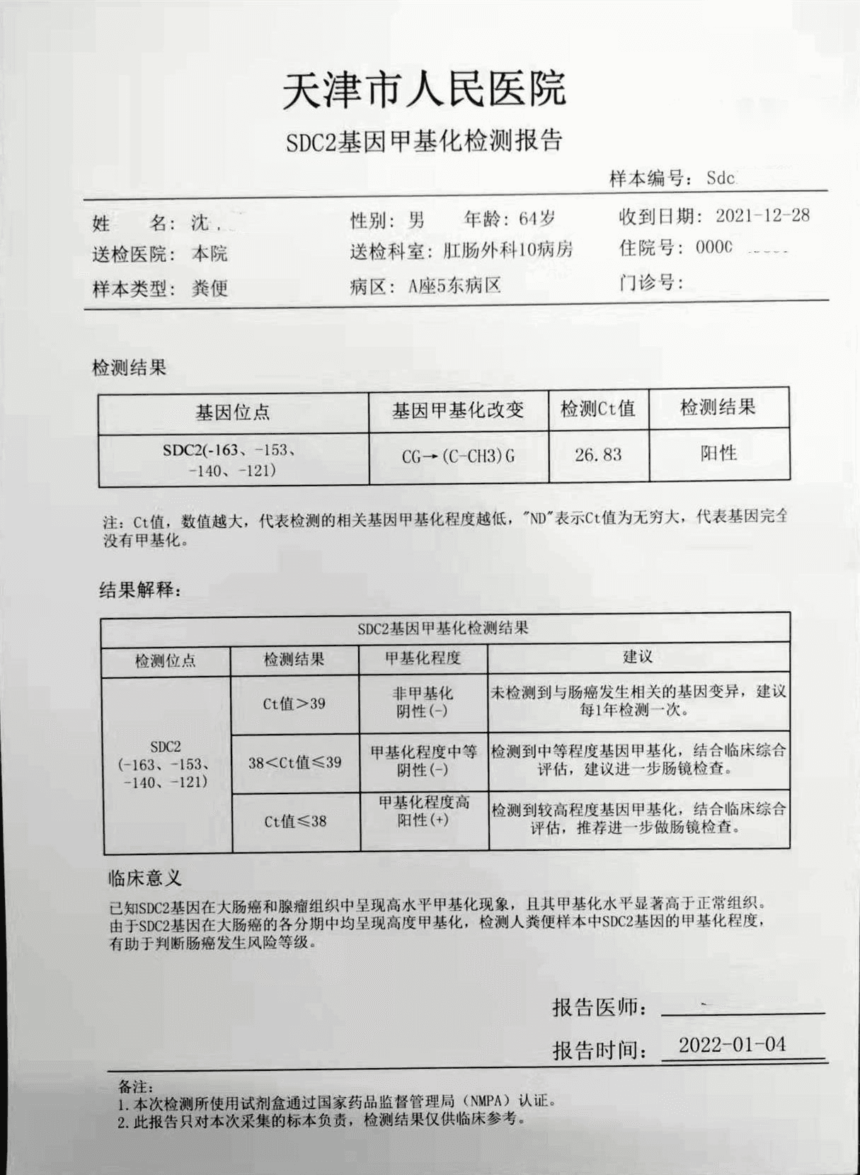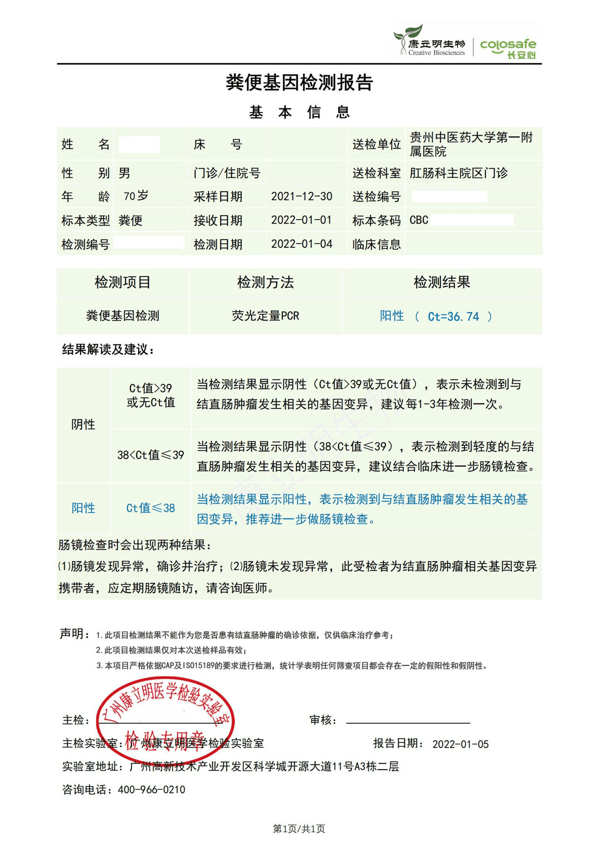 检测时间:2022年1月4日结果:阳性(+);CT值:36.74