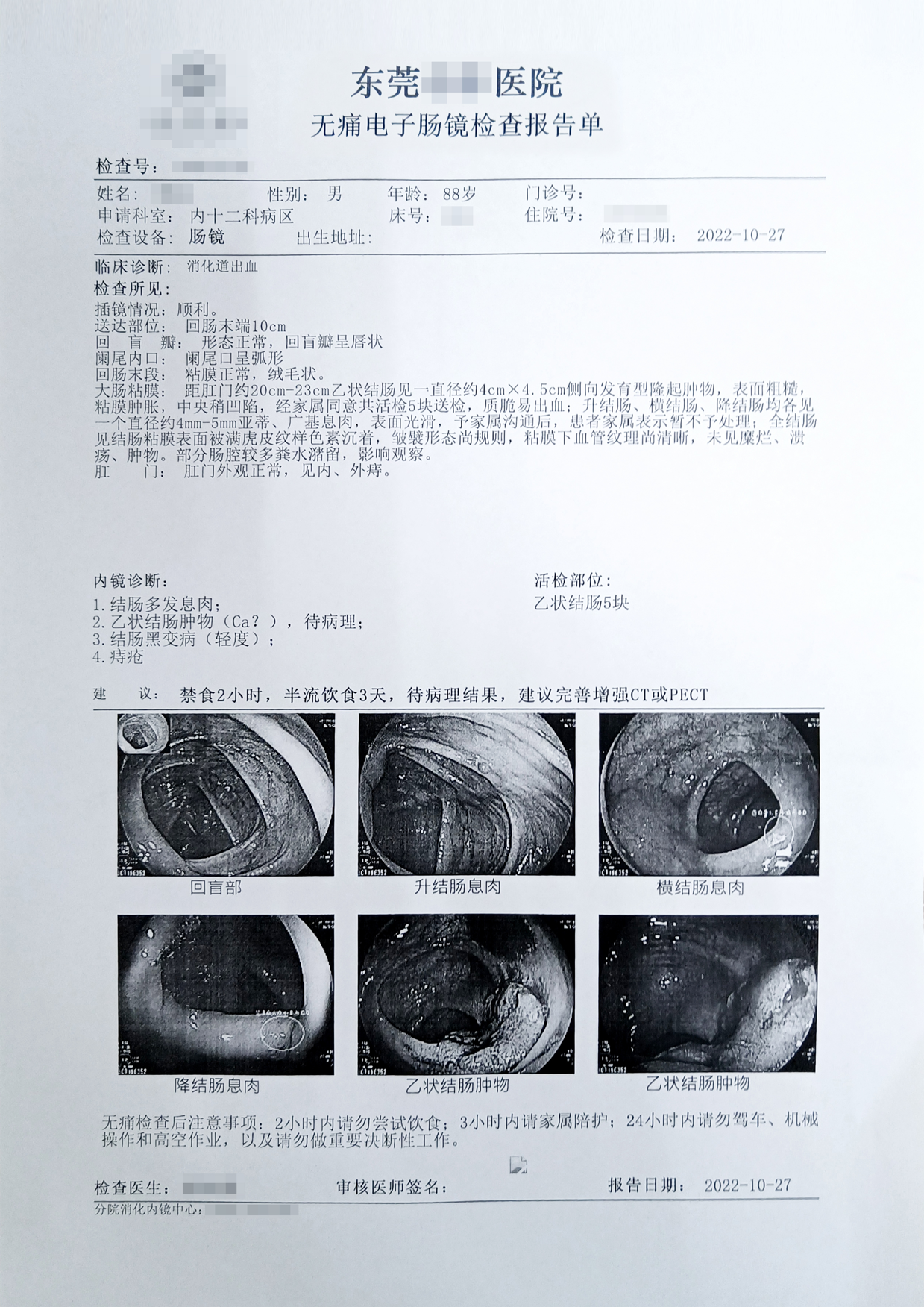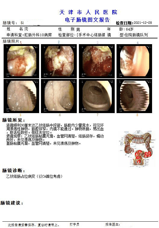 内镜诊断:1、结肠多发息肉2、乙状结肠肿物(CA?)