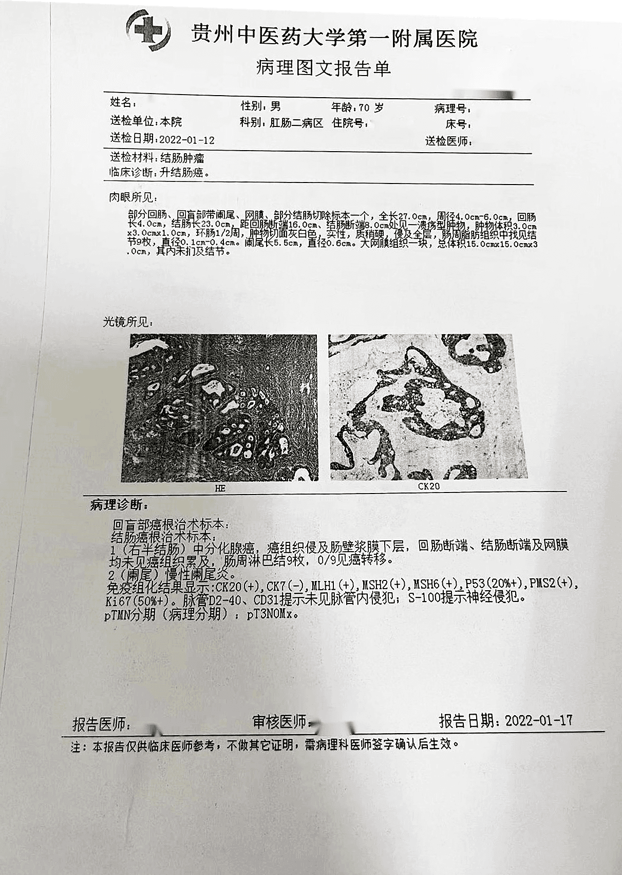 诊断:(升结肠)腺癌,中分化。