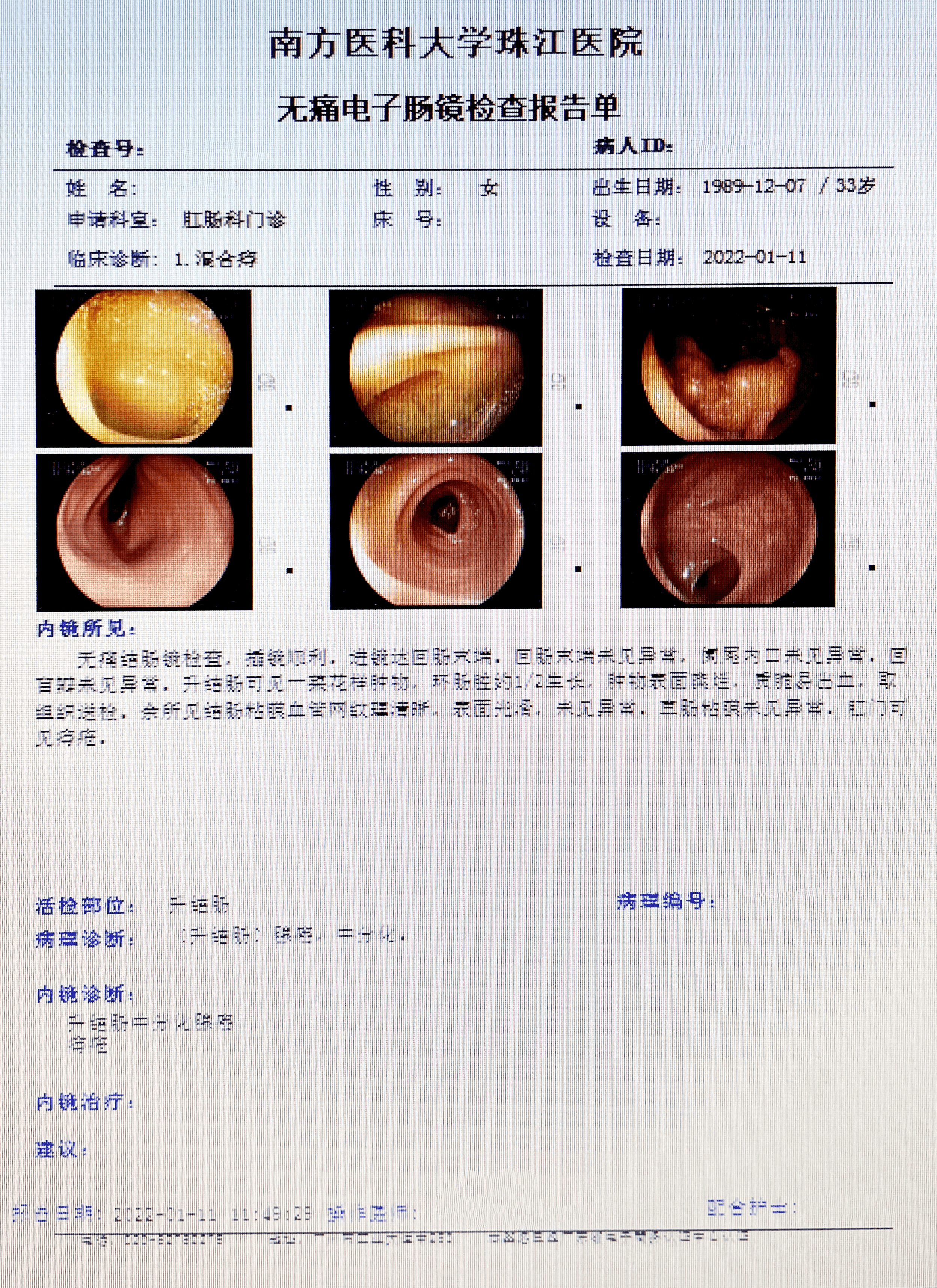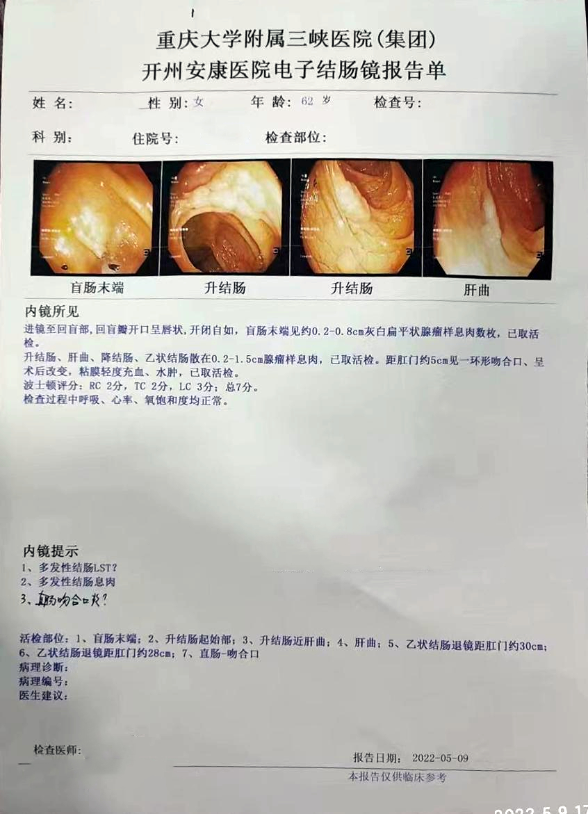 所见:直肠部分粘膜充血水肿,粘膜下血管纹理欠清晰,散见数枚息肉增生,直径约0.2-0.4cm,齿线上下见混合痔。升结肠近肝曲见一环肠腔生长肿瘤,约占肠腔1/2周,表面糜烂,钳取3块组织送检。
