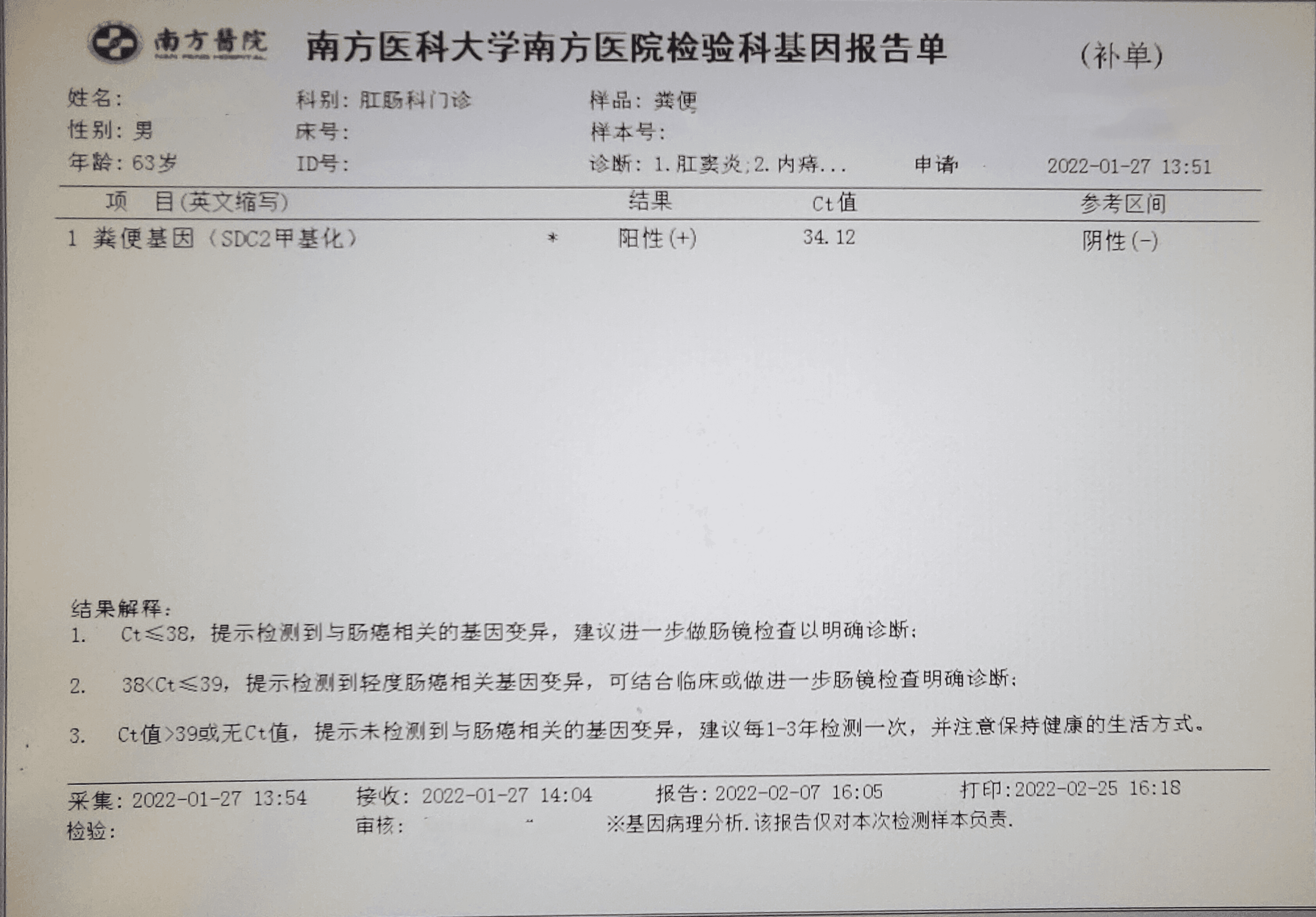 检测时间:2022年7月2日结果:阳性(+);CT值:34.57
