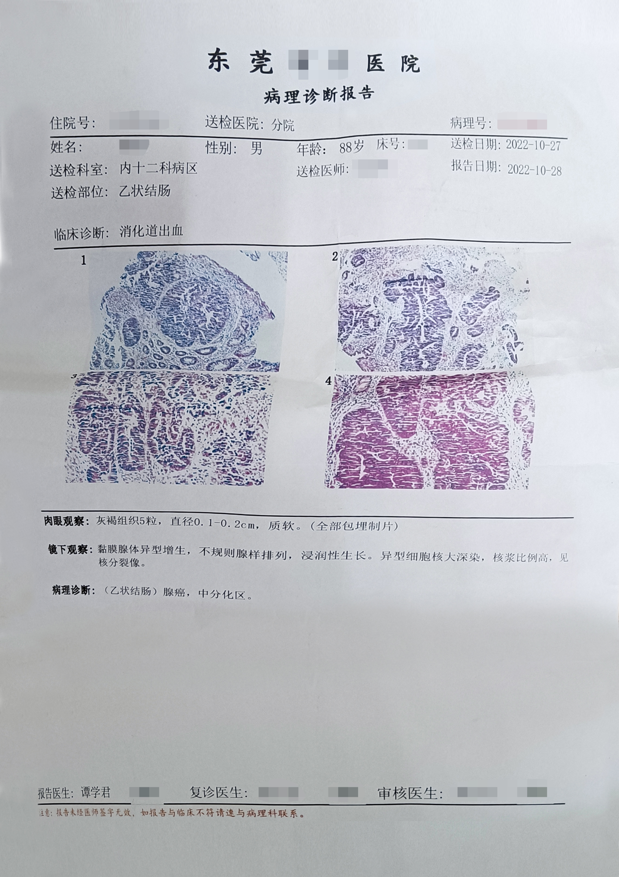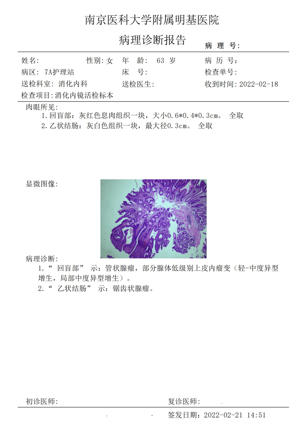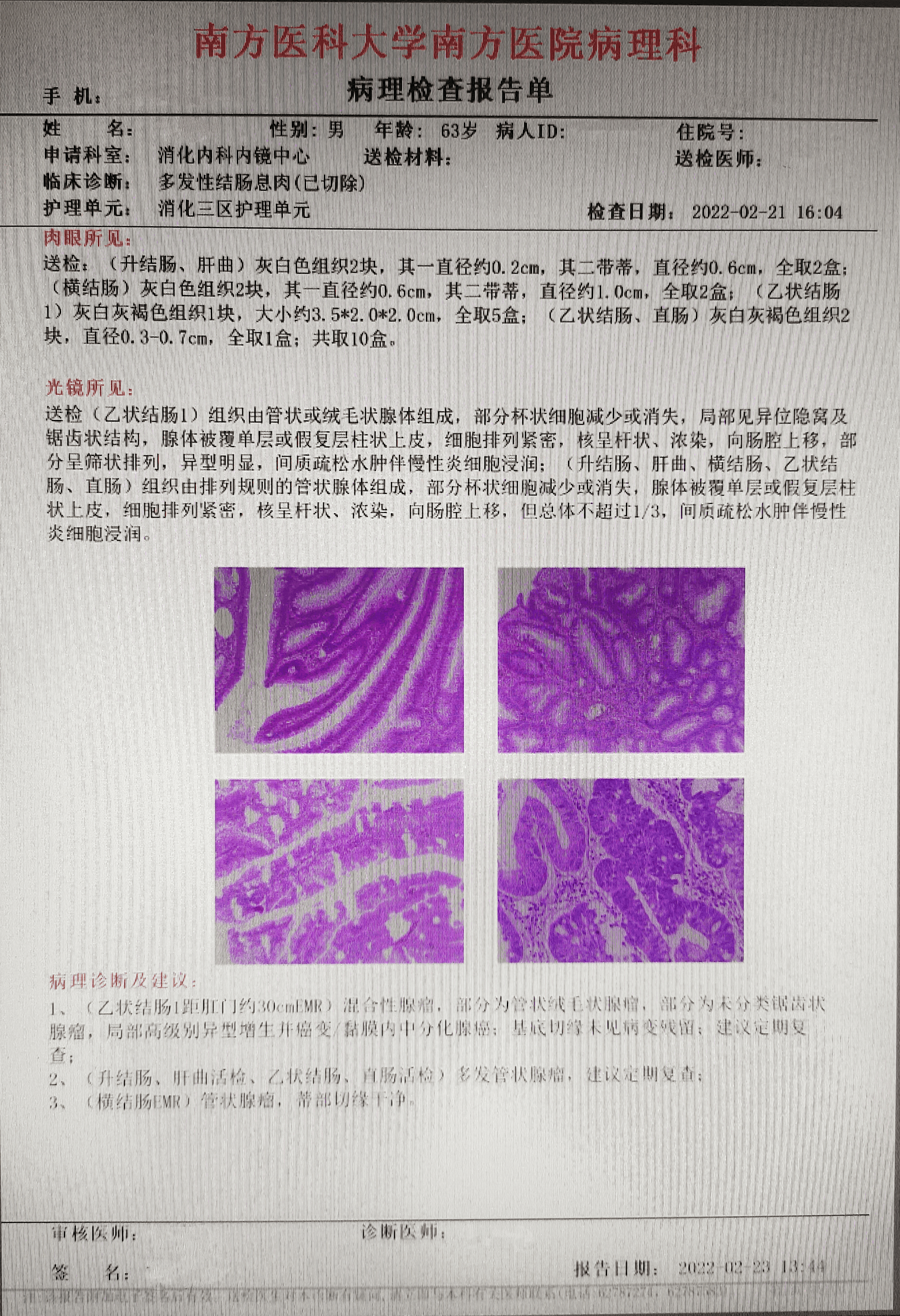1."回盲部" 示∶管状腺瘤,部分腺体低级别上皮内瘤变(轻-中度异型增生,局部中度异型增生)。