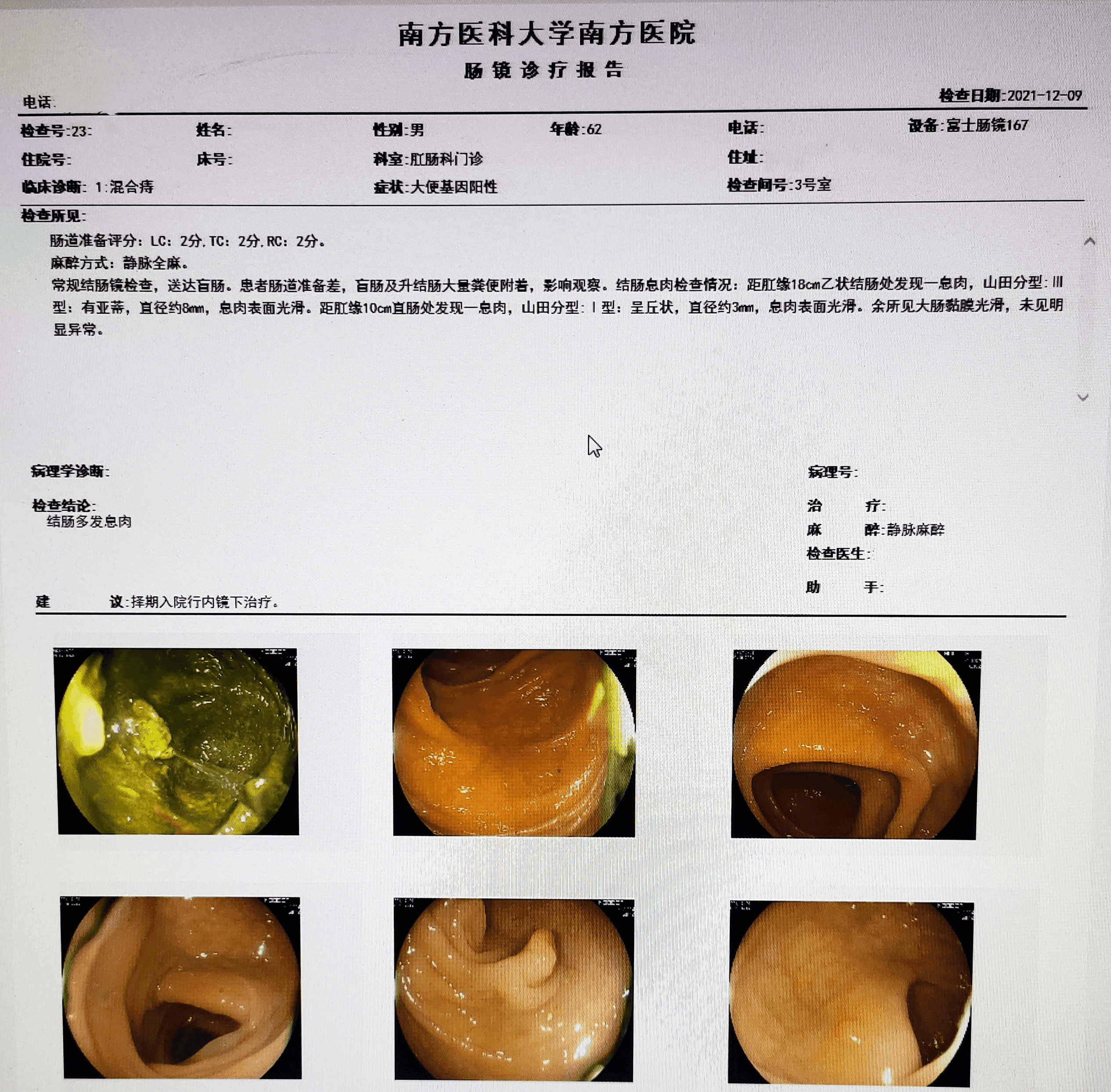 2 、结肠多发息肉电凝术 3、痔