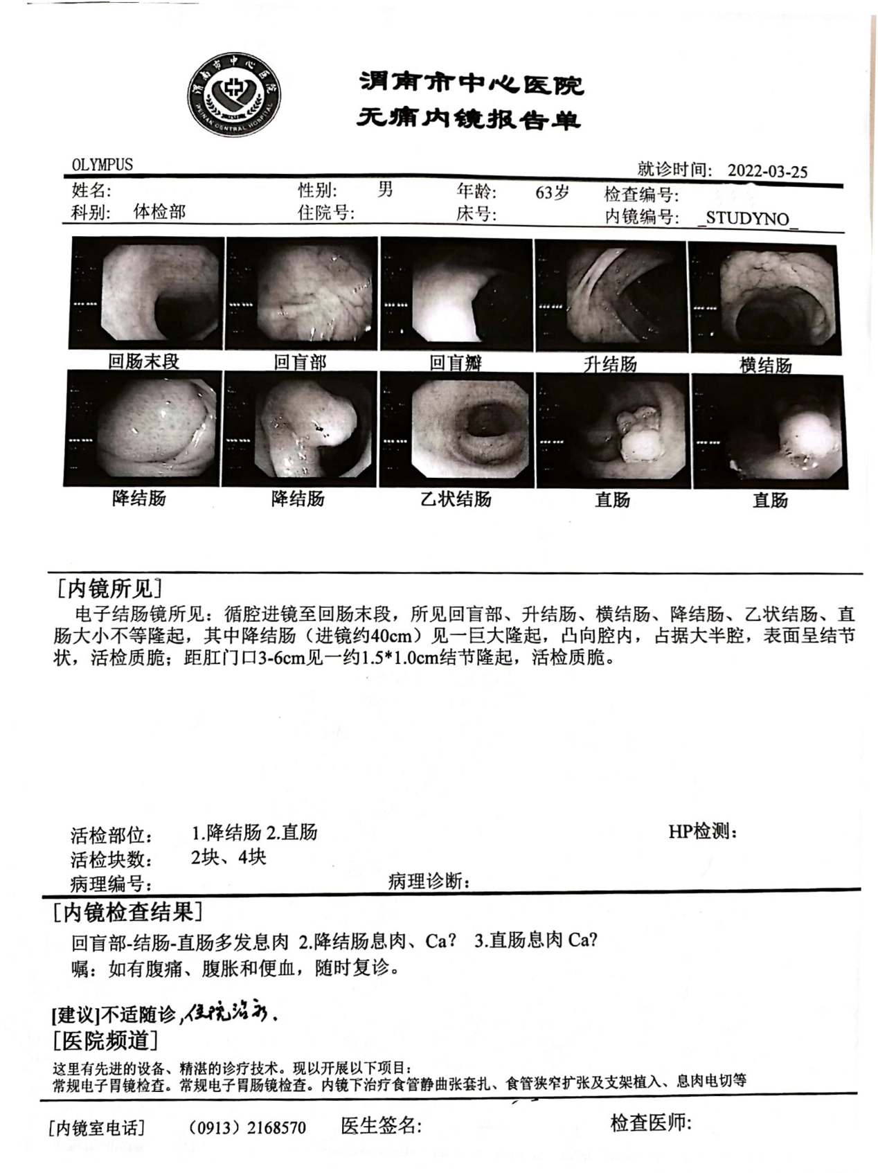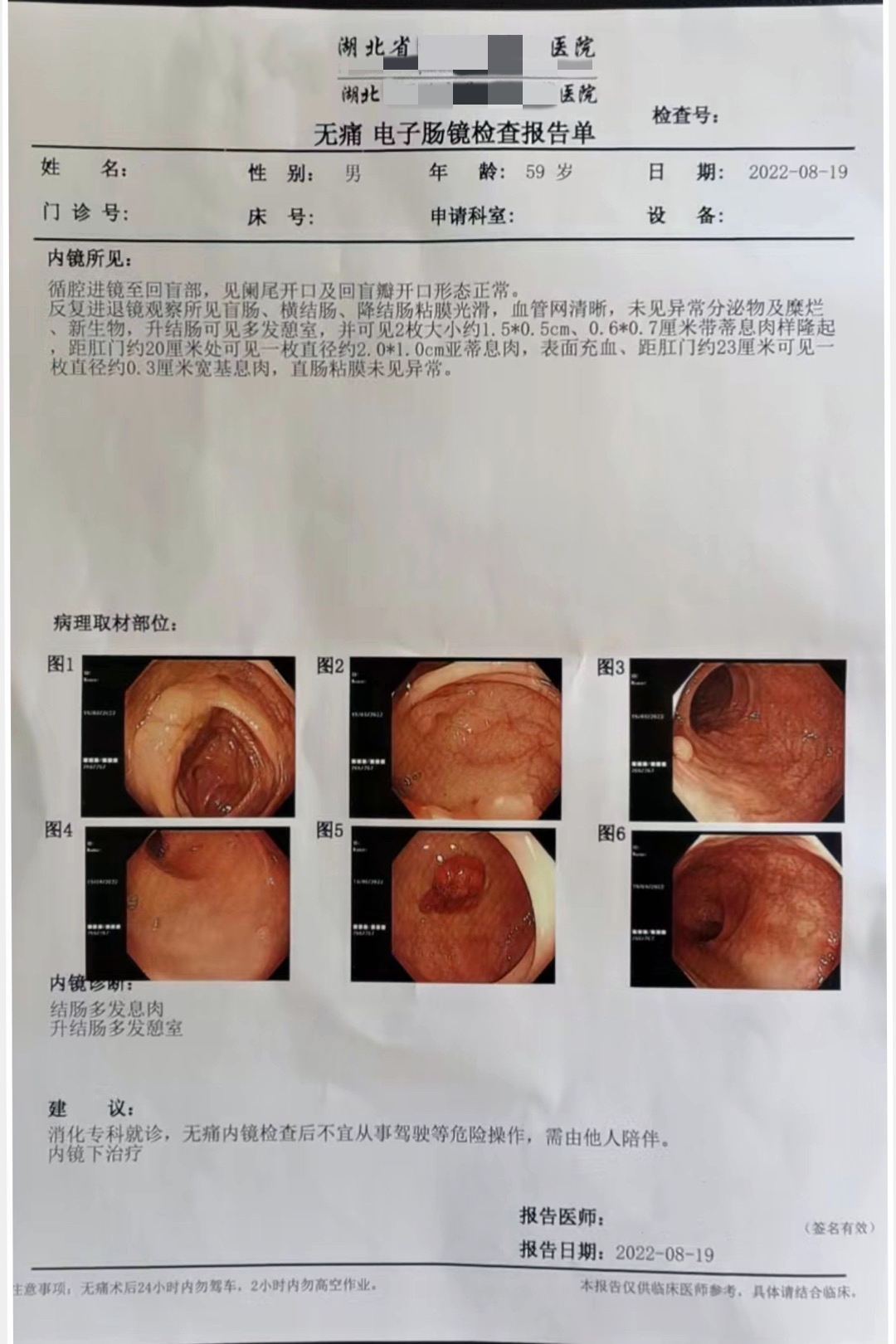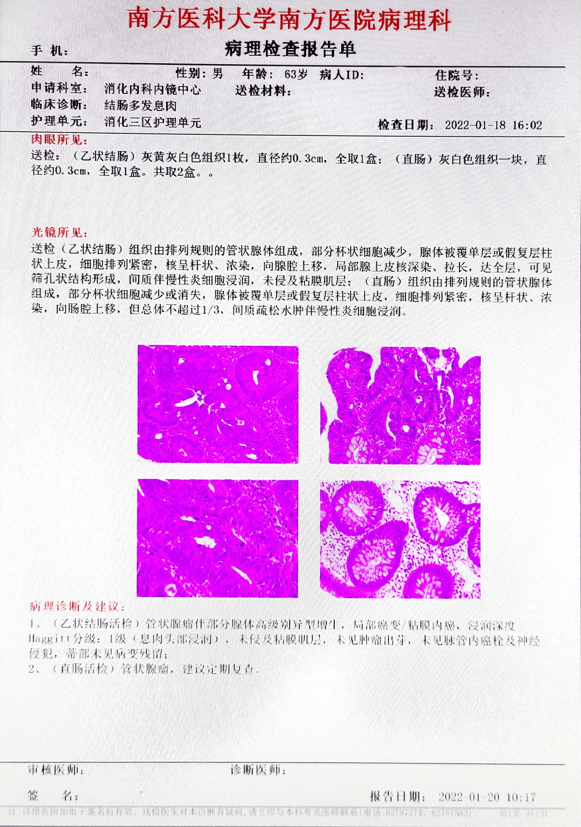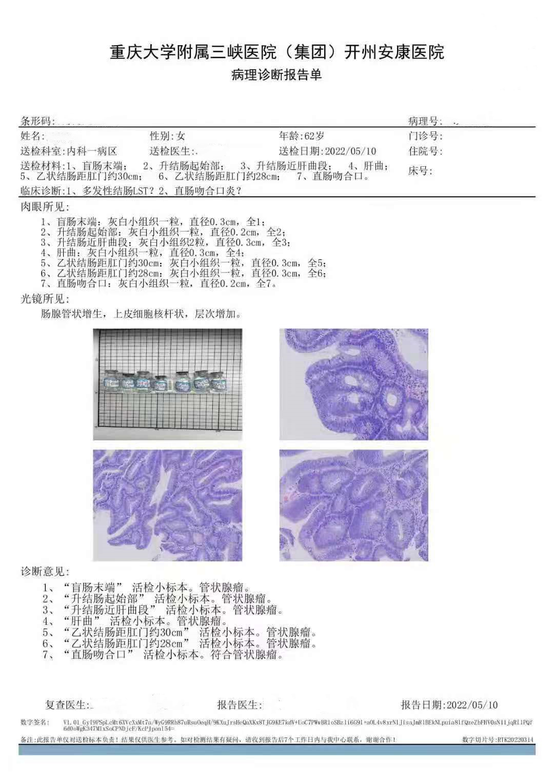 2.(升结肠、肝曲活检、乙状结肠、直肠活检)多发管状腺瘤,建议定期复查;