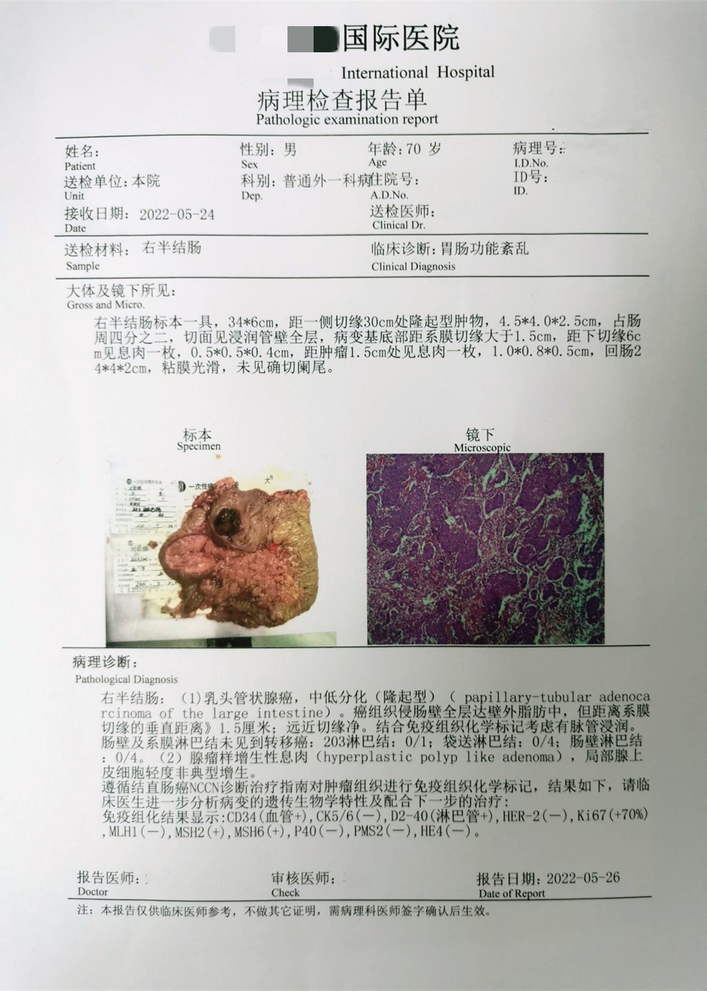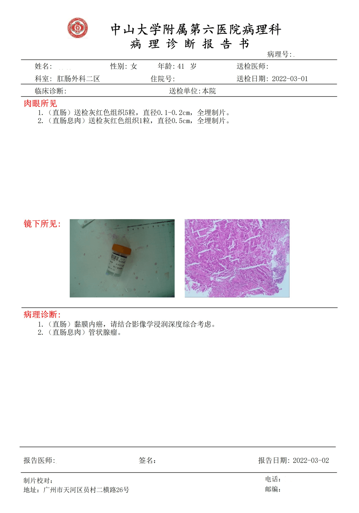 诊断:升结肠中分化腺癌;痔疮。
