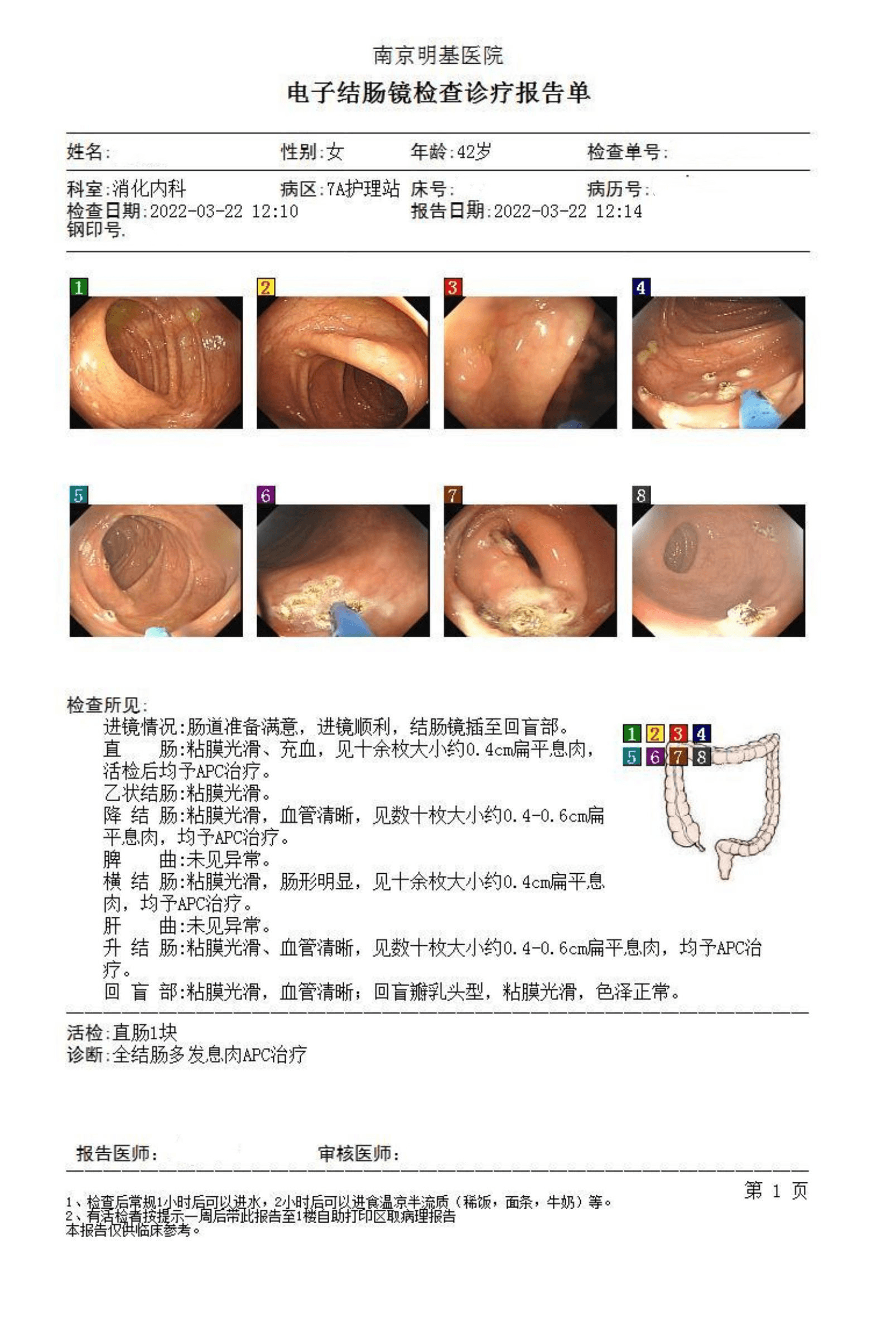 诊断:全结肠多发息肉,APC治疗。