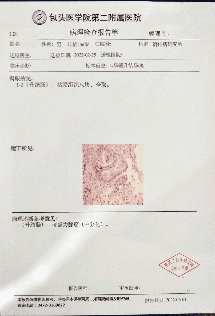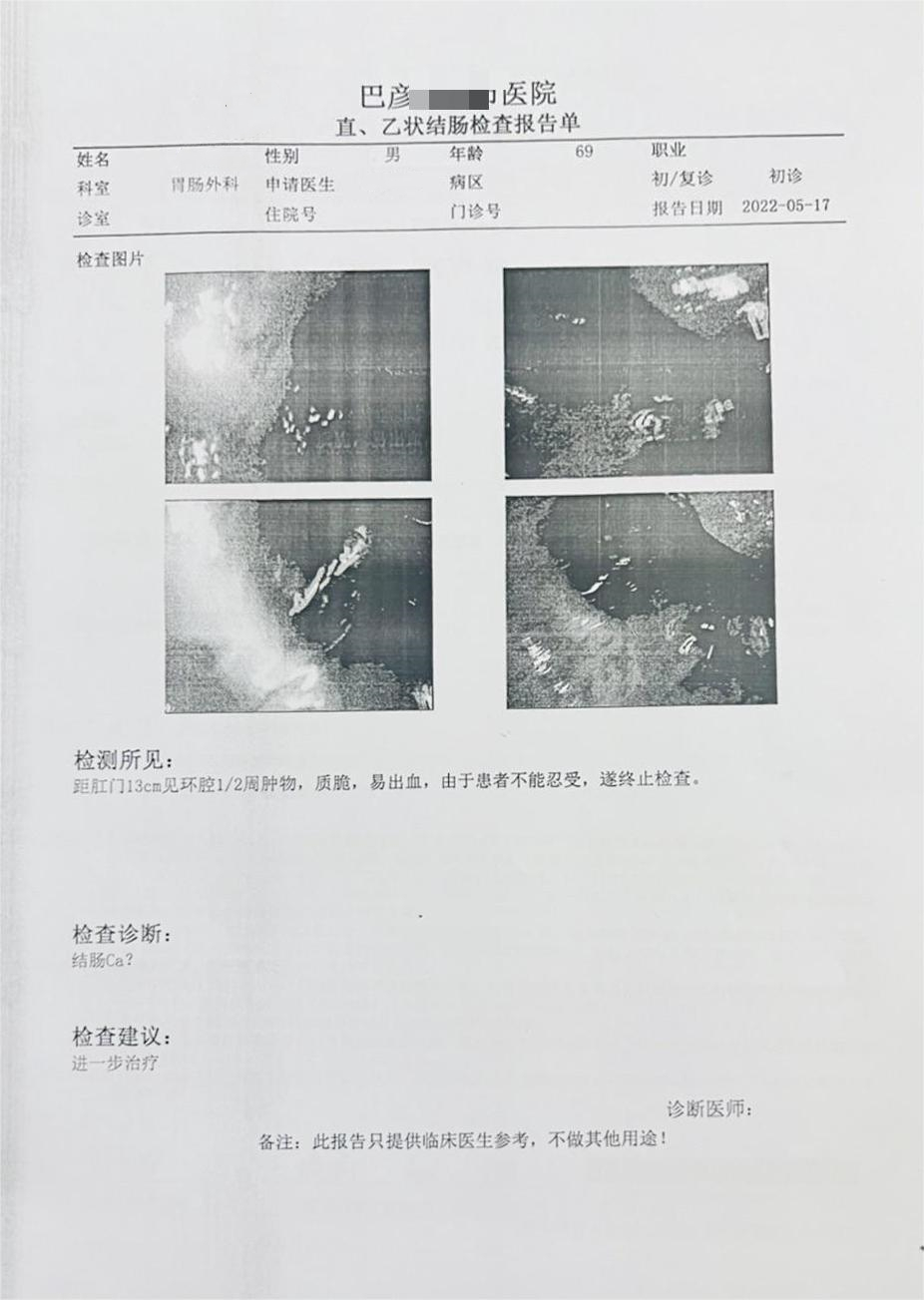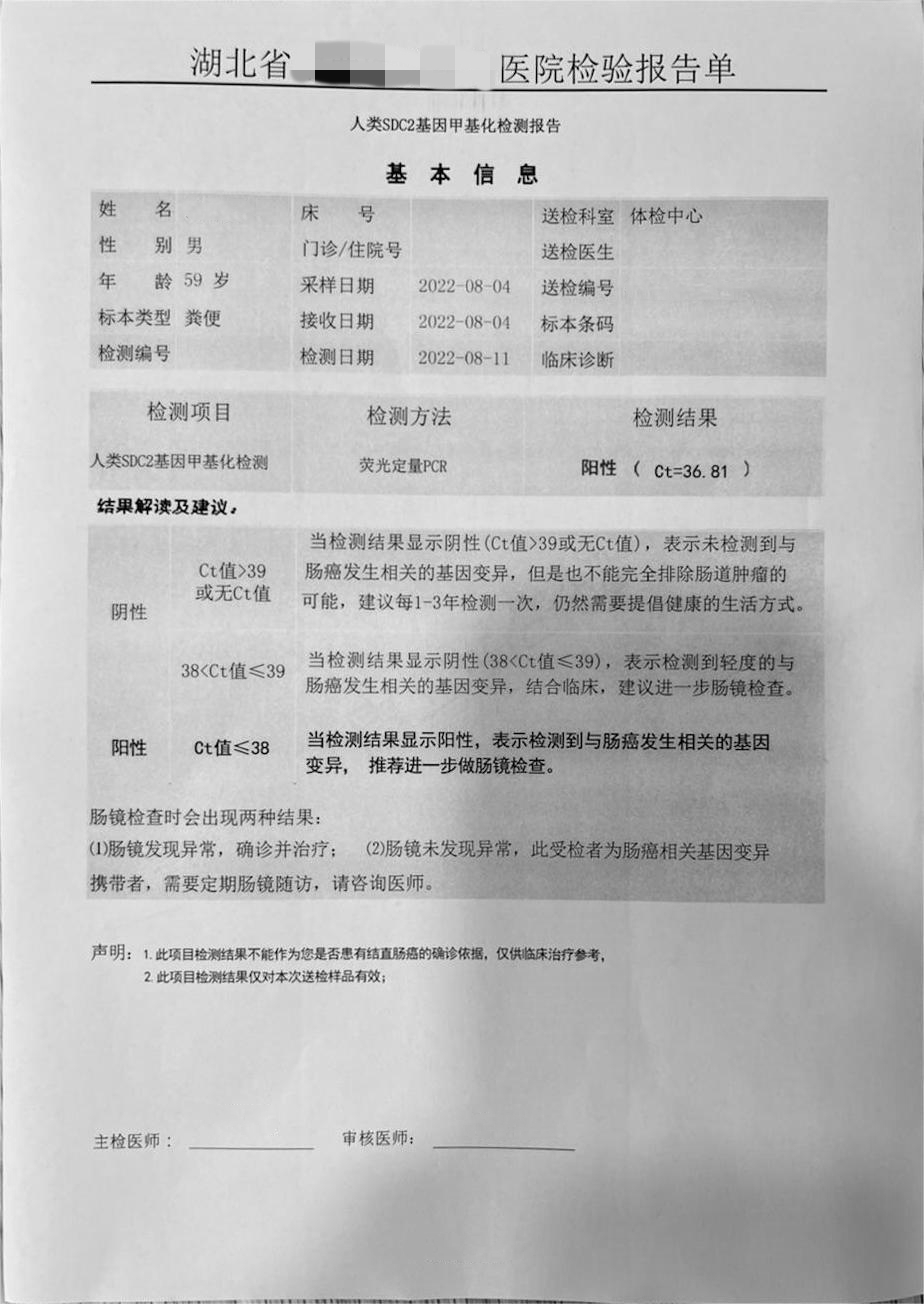 受检者年纪很大,有心血管基础病,一直有吃药控制,在去年年底时因身体不适住院,医生建议做全身检查。做肠道检查时,医生考虑到受检者对于肠镜比较抗拒,便 让受检者做粪便基因检测,检测结果为阳性。医生看到报告后就张先生情况与麻醉科医生进行了会诊,再与受检者以及家属沟通,随即进一步安排了肠镜检查。