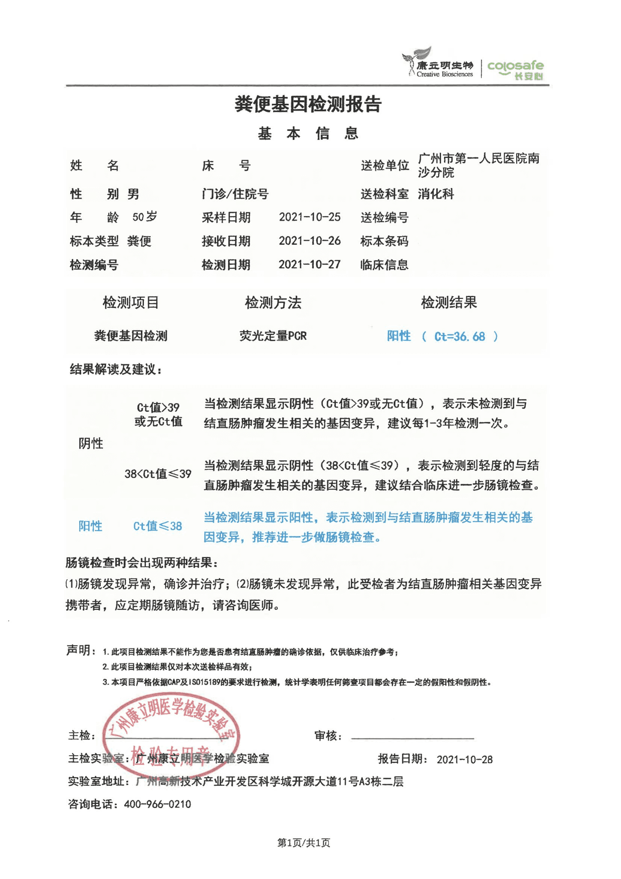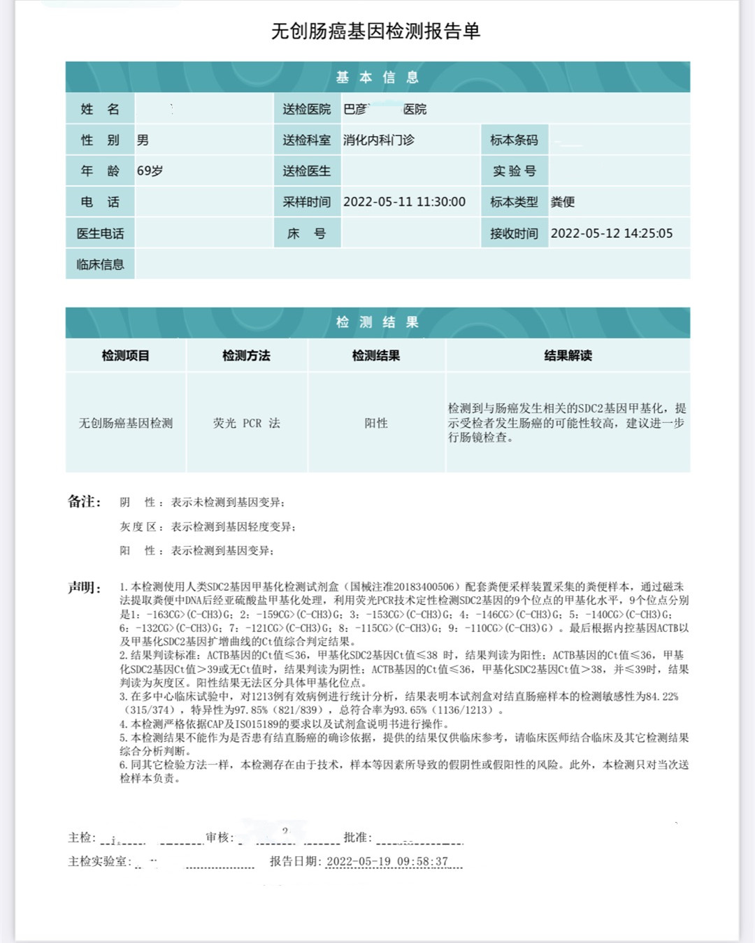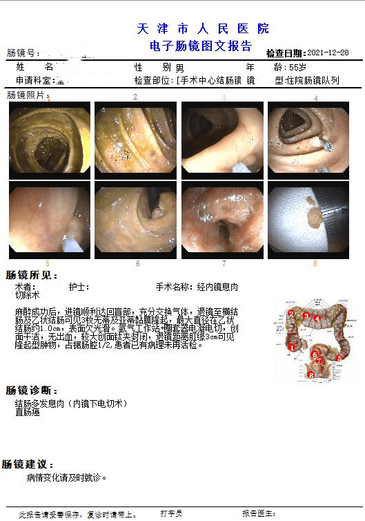 受检者年纪很大,有心血管基础病,一直有吃药控制,在去年年底时因身体不适住院,医生建议做全身检查。做肠道检查时,医生考虑到受检者对于肠镜比较抗拒,便 让受检者做粪便基因检测,检测结果为阳性。医生看到报告后就张先生情况与麻醉科医生进行了会诊,再与受检者以及家属沟通,随即进一步安排了肠镜检查。
