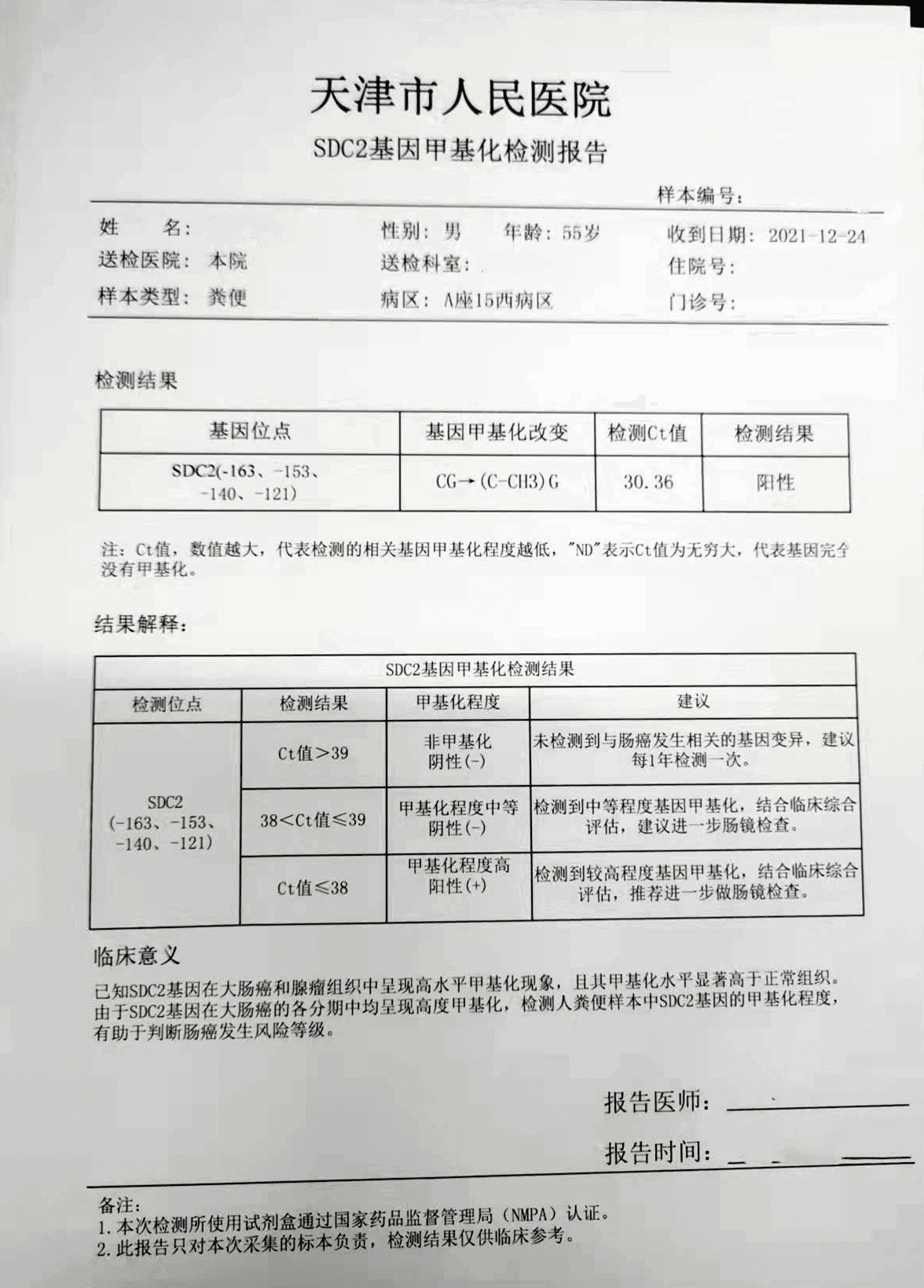 沈先生就诊前1个月出现了便血的情况,当时沈先生以为是痔疮复发,没有太在意,但过去一周便血情况一直没有缓解,还出现了间断腹痛症状。沈先生便去了静海中医院就诊并做了相关化验检查,结果提示了贫血,医生开了对症的中药,但是服药一周并没有改善。沈先生后来辗转就诊了两家医院,最后去到天津市人民医院肛肠科就诊,医生给沈先生开了粪便DNA检测以及肠镜检查同时比对检测。