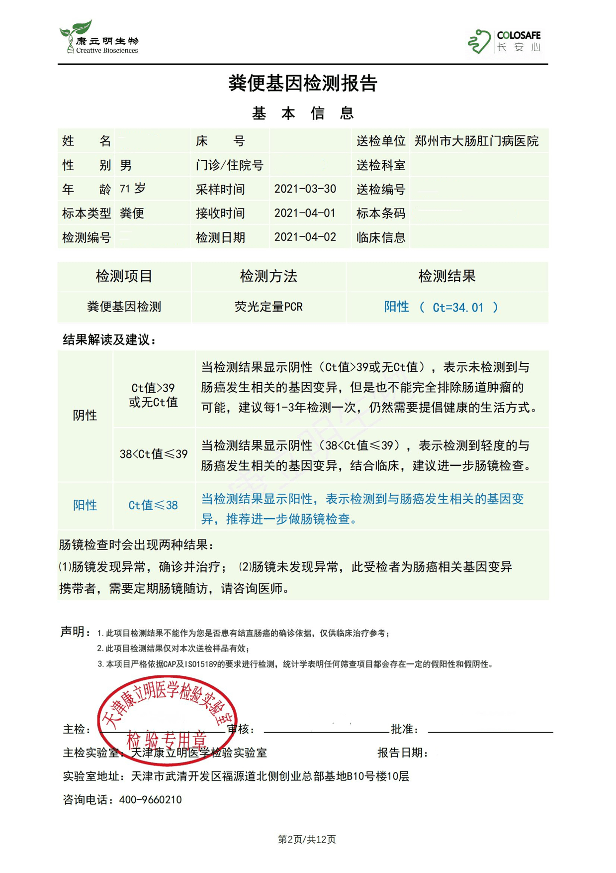 阎先生患有冠状动脉粥样硬化性心脏病,有植入了心脏起搏器,高血压1级。在今年3月,阎先生因肠胃不适到北京某医院消化科就诊,自述有间断反酸、烧心,偶有便秘的症状。医生考虑到阎先生是冠心病患者可能会存在心功能下降和心肌供血不足,进行肠镜检查存在较大风险,便让他先用粪便DNA检测做初步筛查。长安心结果【阳性】,经过医生全面评估后,阎先生在心电监测下进行了胃肠镜检查。