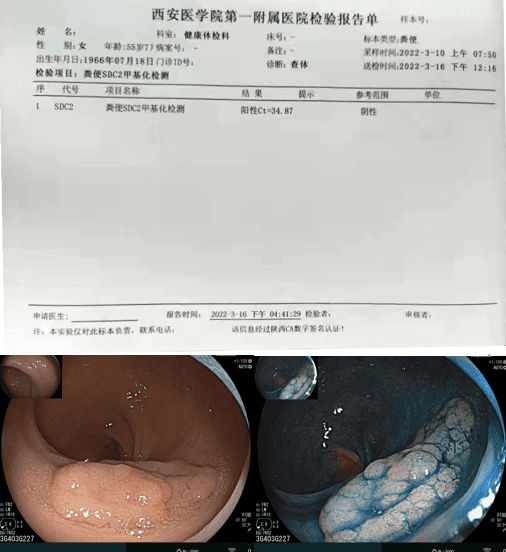 张女士的职业是一名医生,因日常工作繁忙,生活也不太规律,经常需要熬夜值班,嗜食辛辣食物,平日无运动习惯,体重偏胖。前段时间,张女士自觉有大便习惯改变,次数增多,大便偏稀等症状。在其同事建议下使用粪便DNA检测进行检测,结果为阳性。作为医务工作者,张女士平素健康意识较强,且十分了解SDC2粪便DNA检测与金标准(肠镜+病理)的总符合率达到93.65%。张女士便安排到南昌当地的消化科权威医院做进一步肠镜检查及诊疗。