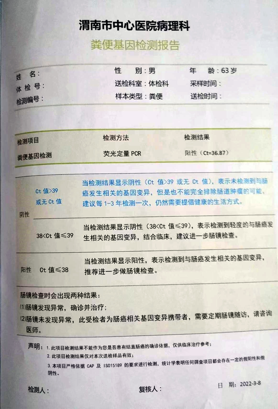 检测时间:2022年3月22日结果:阳性(+);CT值:37.27