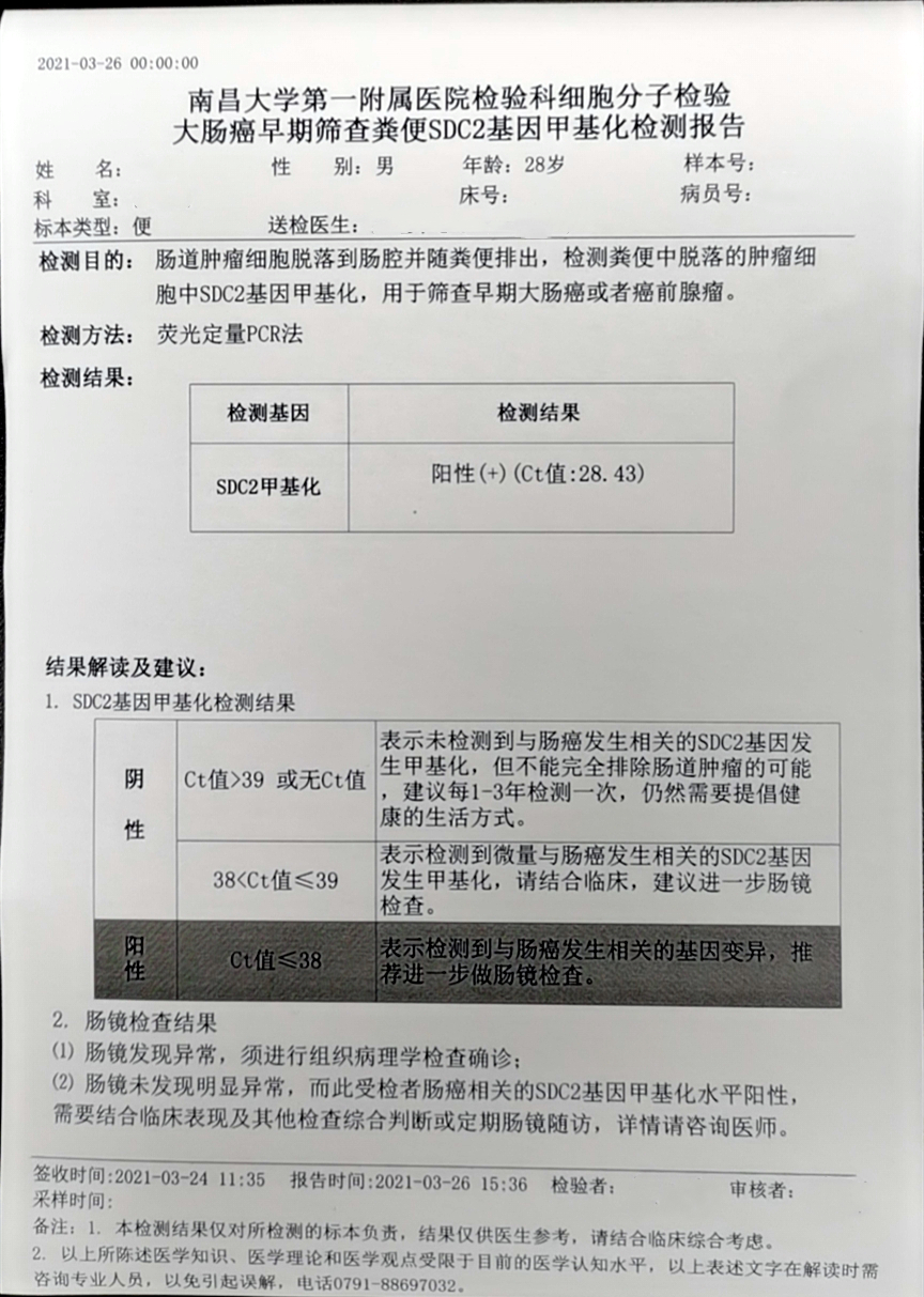 谭先生是一位职工,平日工作比较忙,经常久坐,吃饭大多都是点外卖,比较喜欢重口味饮食。谭先生在检测前有轻微的便血症状,当时他怀疑自己得了痔疮,但没有引起重视。年底时单位安排职工做体检,其中包括了粪便DNA检测,谭先生了解后觉得检测方便准确,第二天便马上送检了样本。检测结果为阳性,看到报告后谭先生比较担心,第二天便到医院预约进一步做肠镜检查。