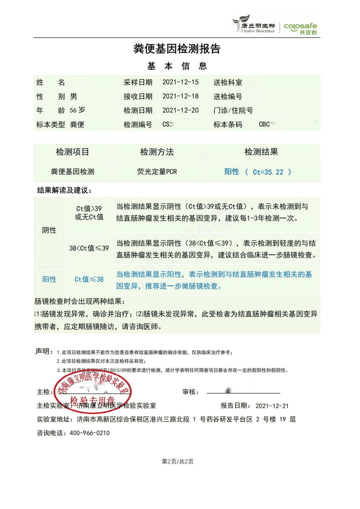 检测时间:2021年12月20日结果:阳性(+);CT值:35.22