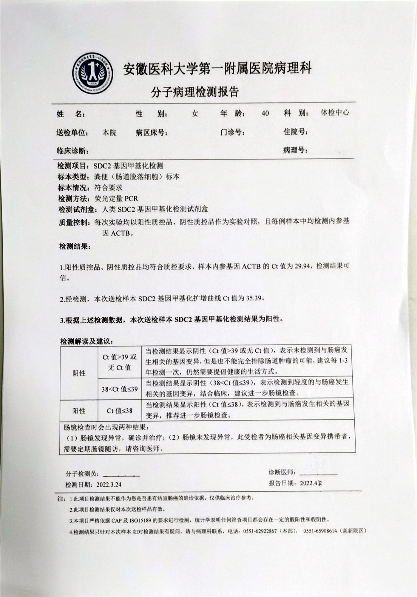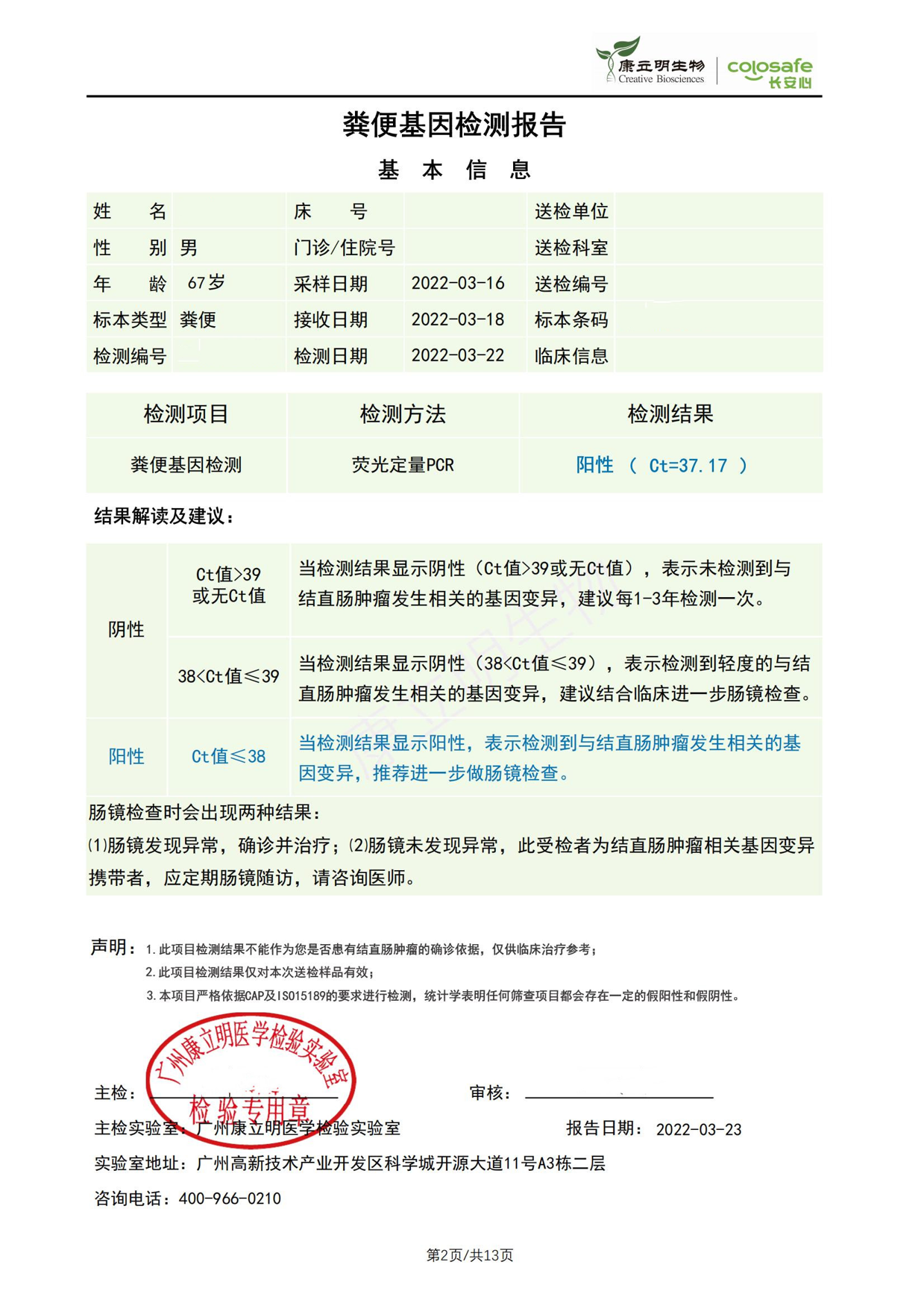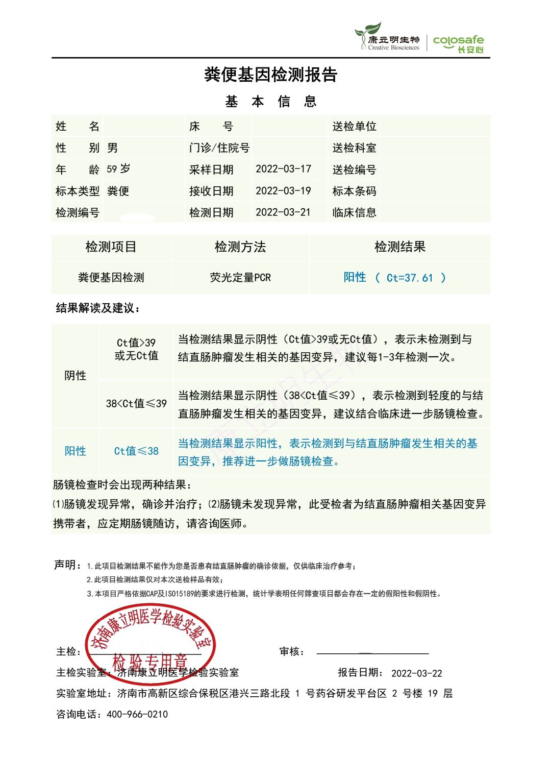 检测时间:2022年3月23日结果:阳性(+);CT值:37.65
