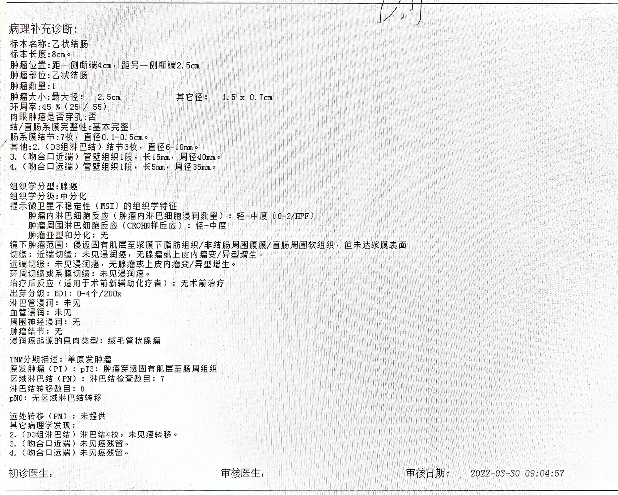 病理诊断:(乙状结肠)腺癌,中分化区。 pTNM/ypTNM分期:pT2N1a