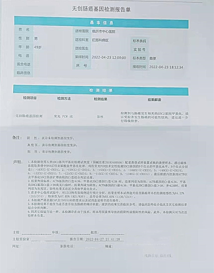 李先生是生活在北京的一名白领人士,长期有久坐习惯,但日常作息时间和饮食都很规律,个人比较有健康意识。前段时间李先生跟朋友聊到近来偶尔有大便不规律,不成型的情况,朋友大力推荐李先生使用粪便DNA检测。李先生经过一番了解,考虑到自身年龄和长期久坐的情况,便在网上自行下单购买了一份,居家采样后寄送到检测所检测。几天后李先生接到来电解读报告,细心地告知李先生的样本检测结果为【阳性】,出现肠道肿瘤的风险较高,并建议其尽快到医院做肠镜检查。李先生听从了客服建议,马上请假安排了到医院进一步做检查。