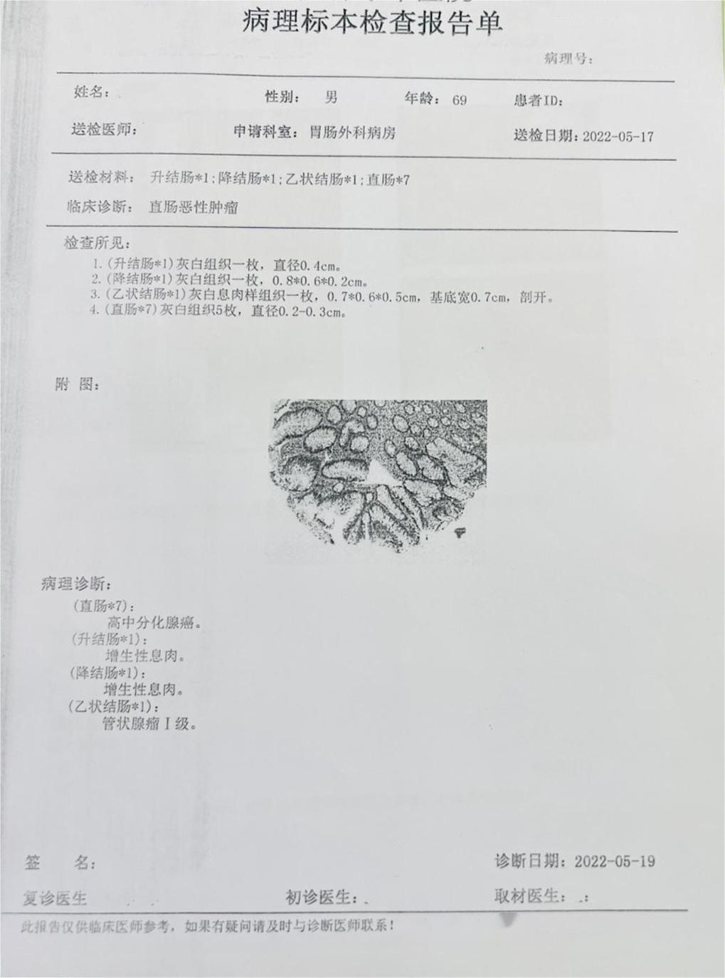 (直肠):高中分化腺癌,cT3N0M0 。 (升结肠):增生性息肉。 (降结肠):增生性息肉。 (乙状结肠):管状腺瘤Ⅰ级。