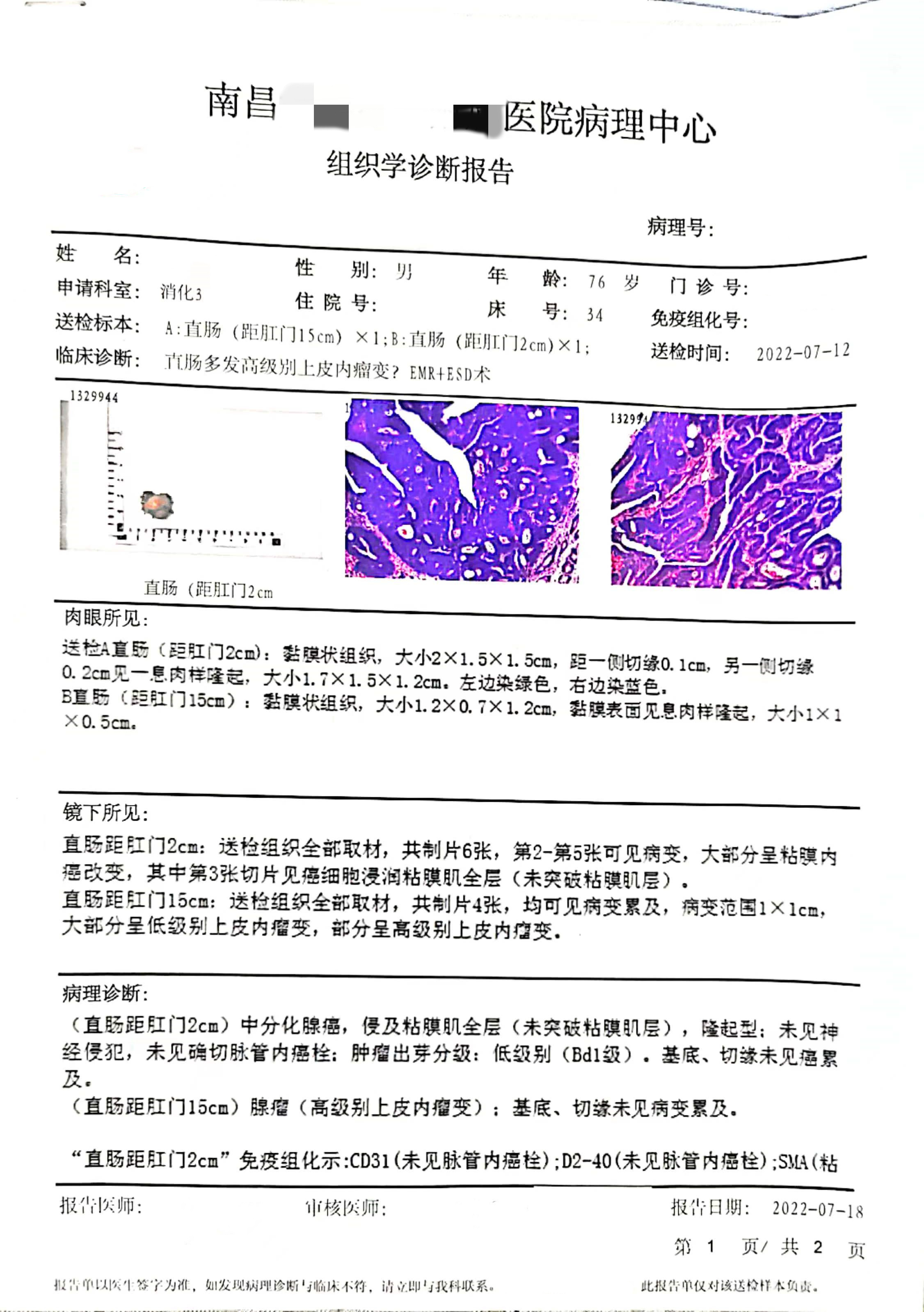 (直肠距肛门2cm)中分化腺癌,侵及粘膜肌全层(未突破粘膜肌层),隆起型:未见神经侵犯,未见确切脉管内癌栓;肿瘤出芽分级:低级别(Bd1级) .基底、切缘未见癌累及。(直肠距肛门15cm)腺瘤 (高级别上皮内瘤变) ,基底、切缘未见病变累及。