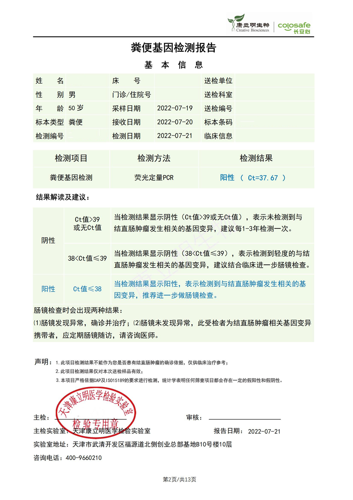 检测时间:2022年7月19日结果:阳性(+);CT值:37.67