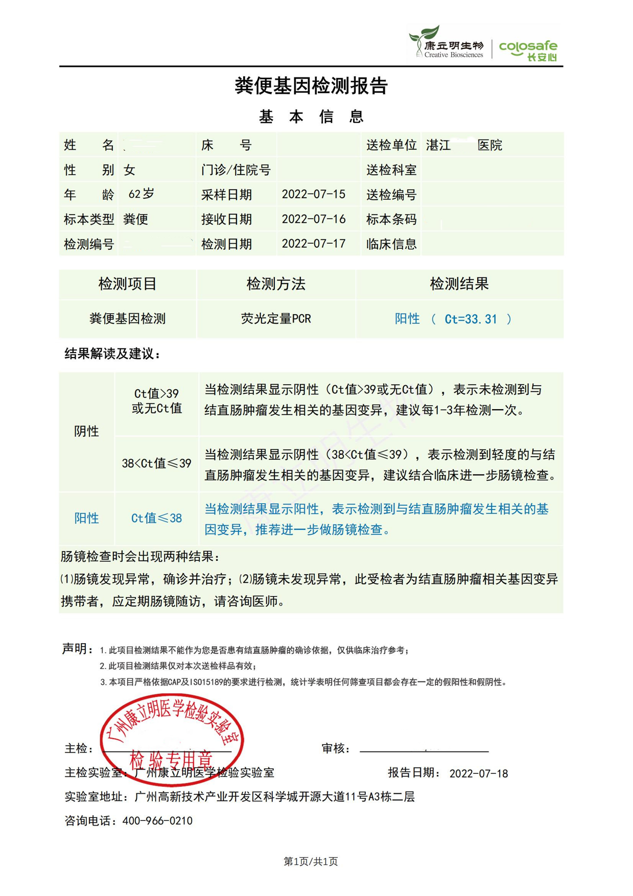 检测时间:2022年7月15日结果:阳性(+);CT值:33.31