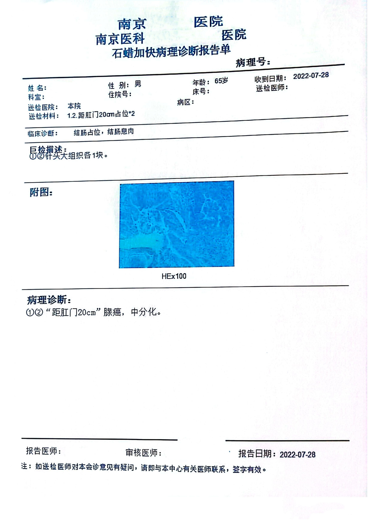 “距肛门20cm”腺癌,中分化。