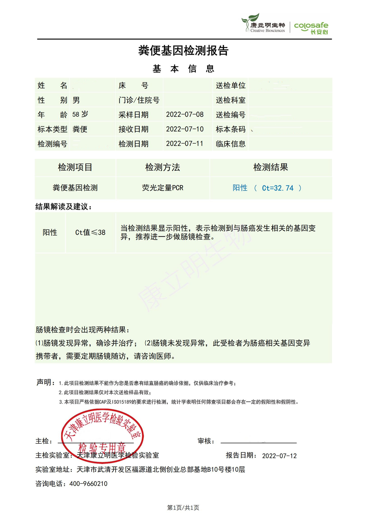 检测时间:2022年7月8日结果:阳性(+);CT值:32.74