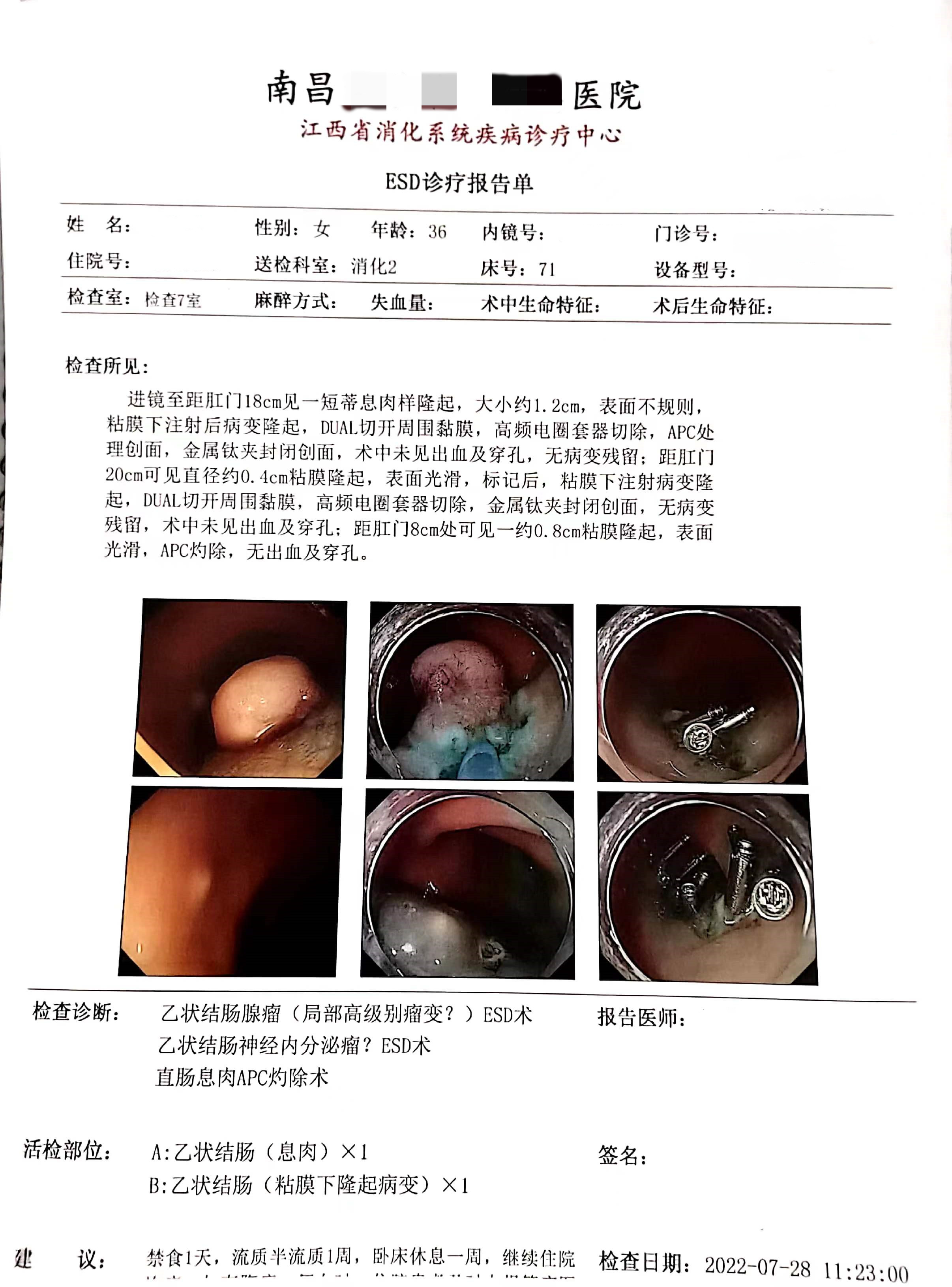 诊断∶直肠肿物(待病理);直肠息肉(EMR切除,待病理)。