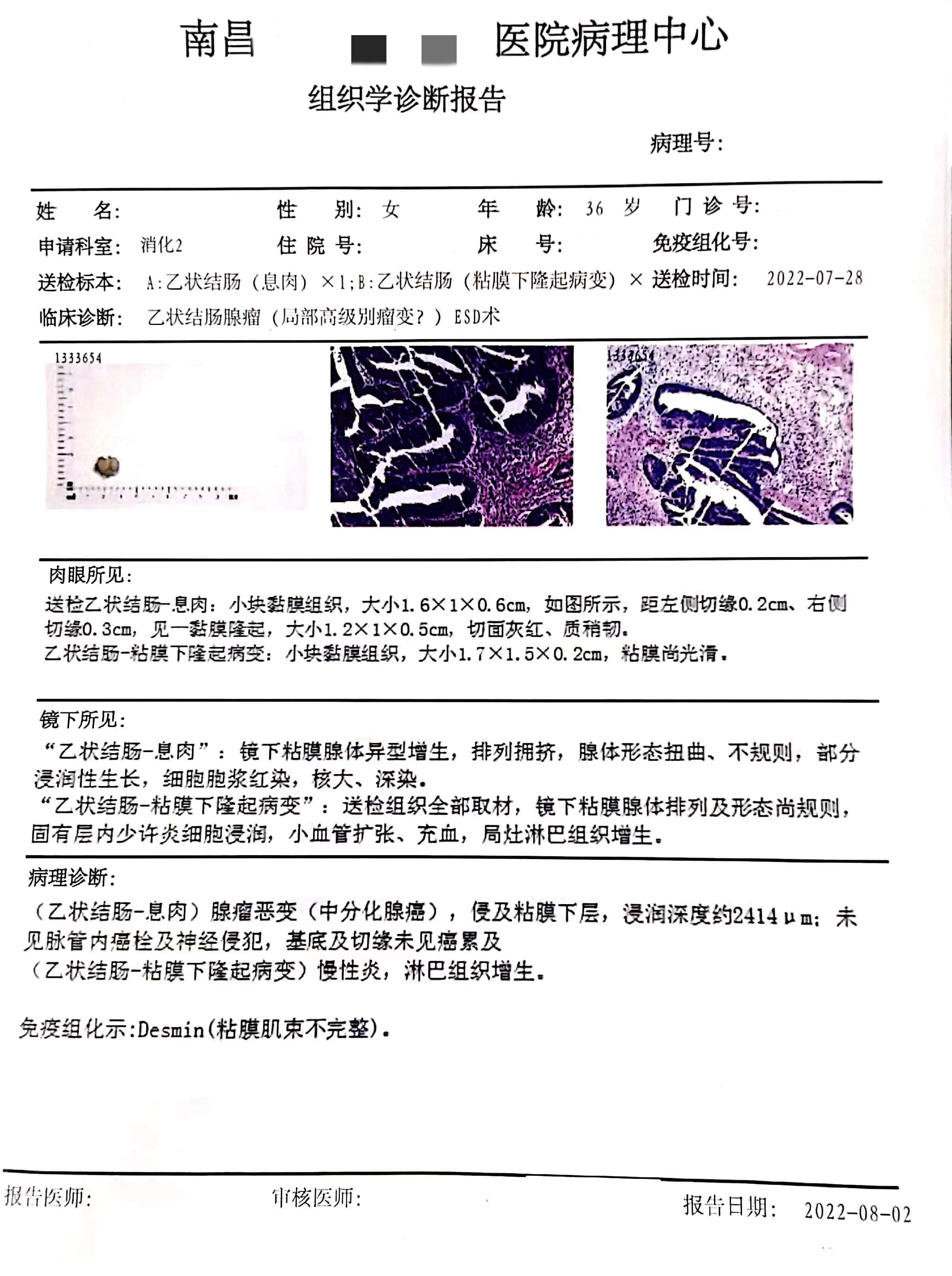1、“降结肠”ESD标本:管状腺瘤,腺上皮低级别上皮内瘤变,灶性区域高级别上皮内瘤变伴粘膜内癌形成。