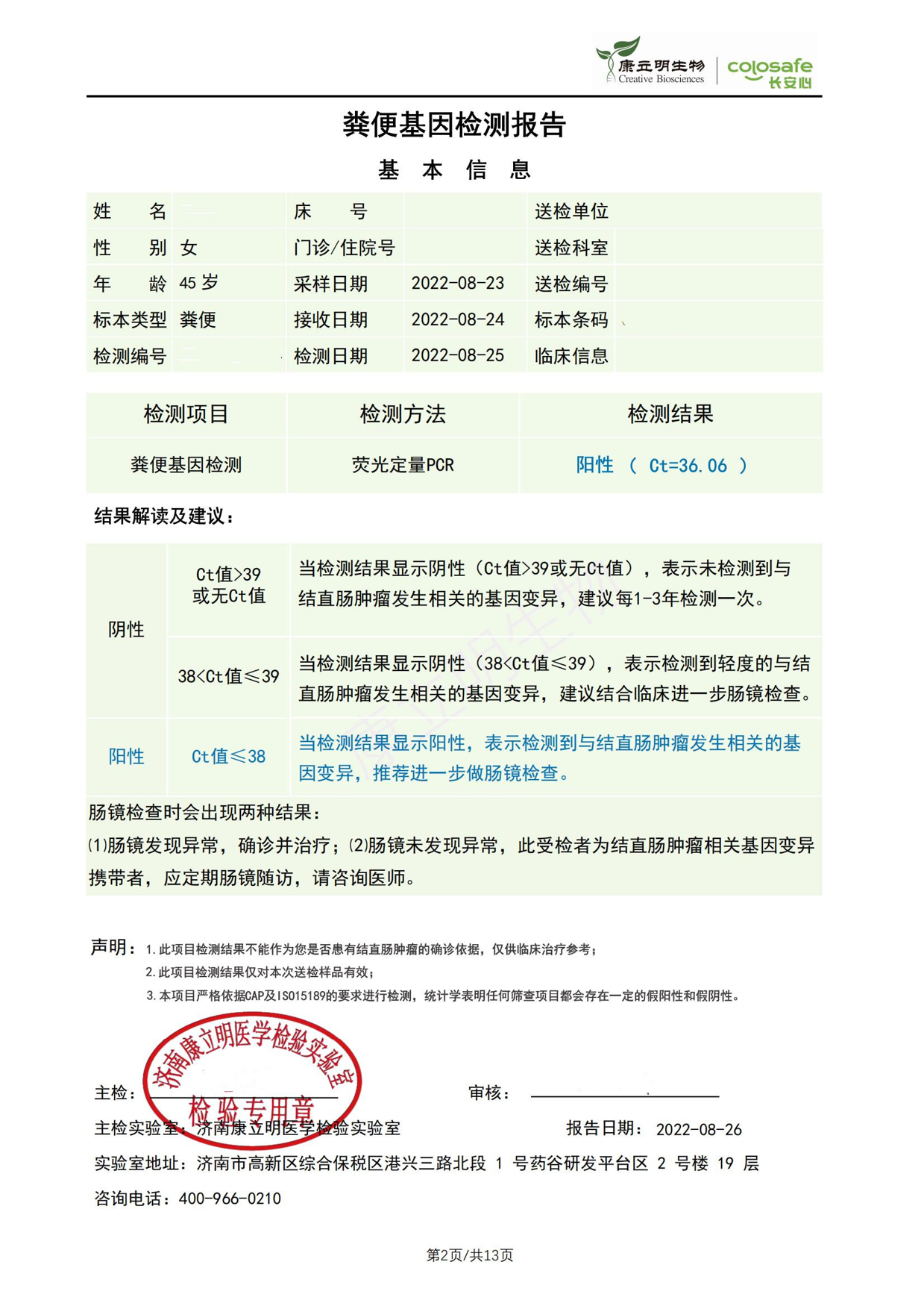 检测时间:2022年8月23日结果:阳性(+);CT值:36.06