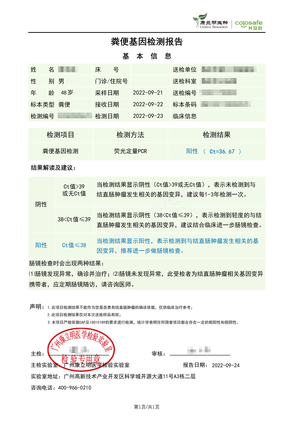 检测时间:2022年9月21日结果:阳性(+);CT值:36.67