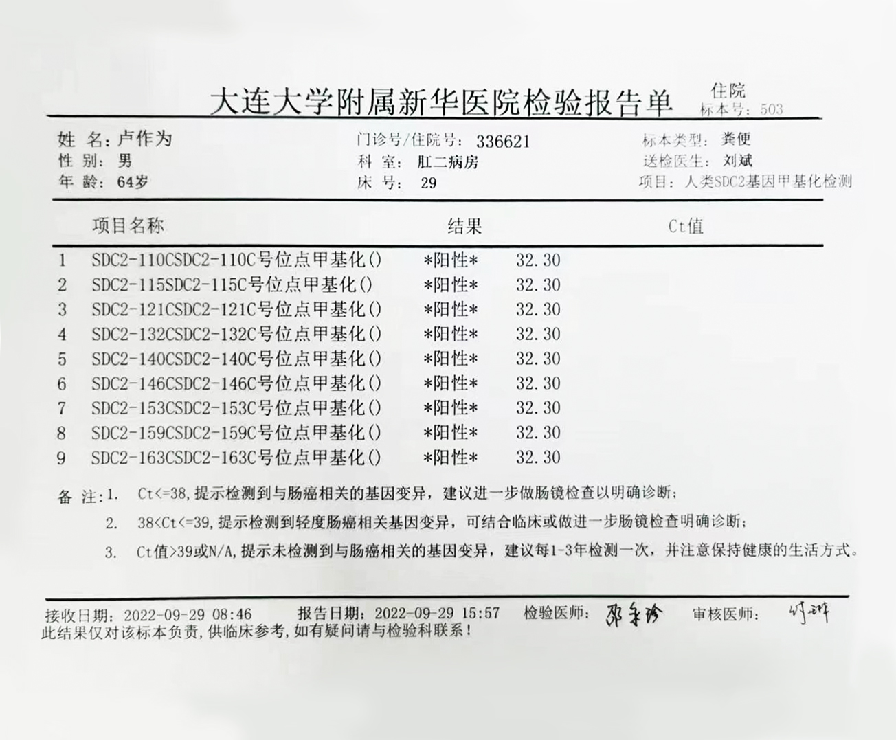 检测时间:2022年9月29日结果:阳性(+);CT值:32.30