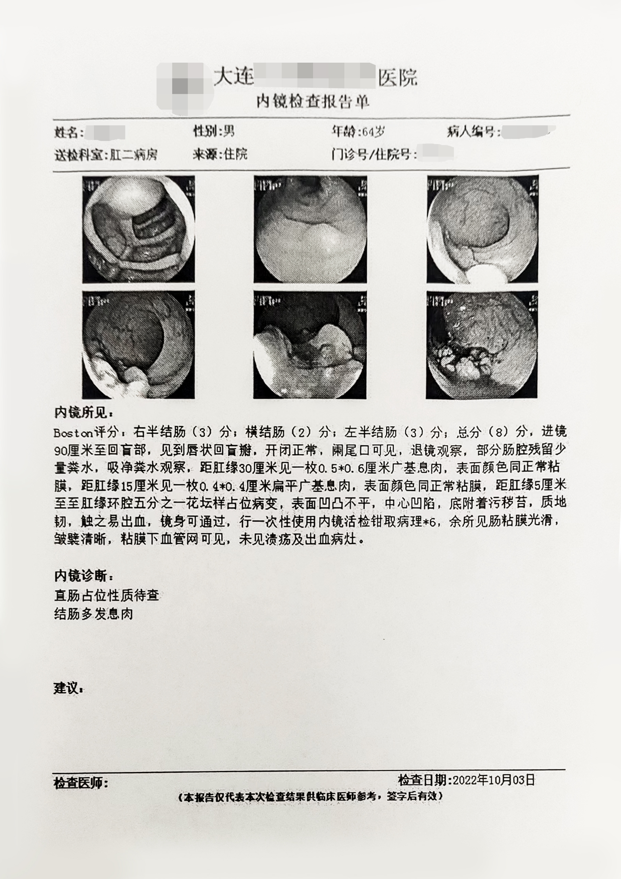 检查所见:直肠黏膜光滑,血管网清晰,距肛门10CM见30*30mm巨大息肉。