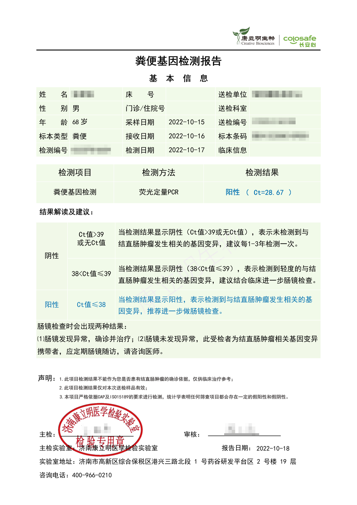 检测时间:2022年10月15日结果:阳性(+);CT值:28.67