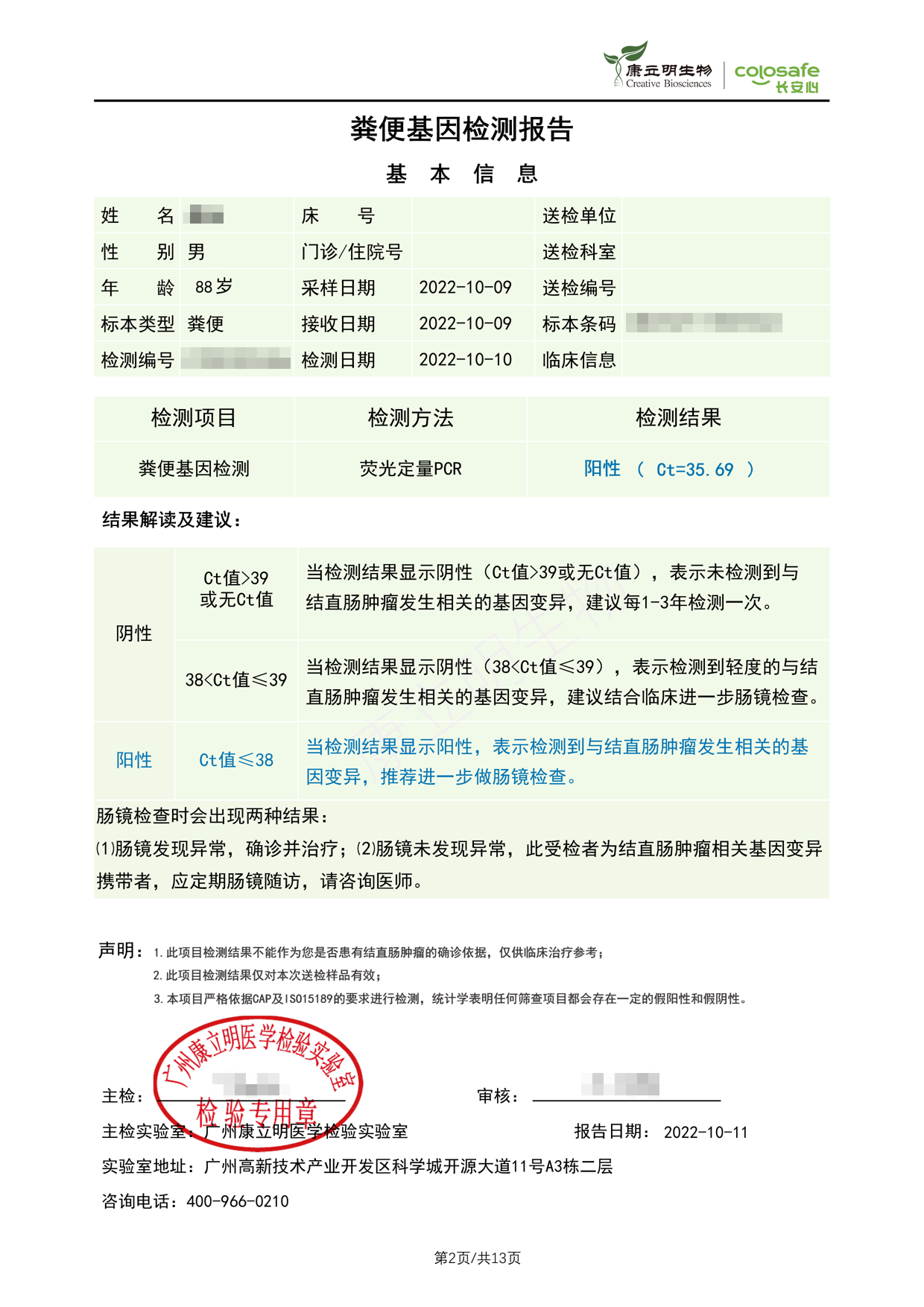 检测时间:2022年10月9日结果:阳性(+);CT值:35.69