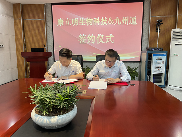 2021年9月8日下午,广州康立明生物科技股份有限公司(以下简称“康立明生物”)与中国药品零售市场第一大配送商九州通医疗器械集团有限公司在武汉市九州通总部举行战略合作签约仪式。康立明生物大健康副总裁官鑫、九州通医疗器械集团副总经理杨亮代表合作双方现场签署了战略合作协议,康立明生物体检健管事业部总监开阳及九州通IVD发展本部推广总监陈磊等现场见证了本次签约仪式。