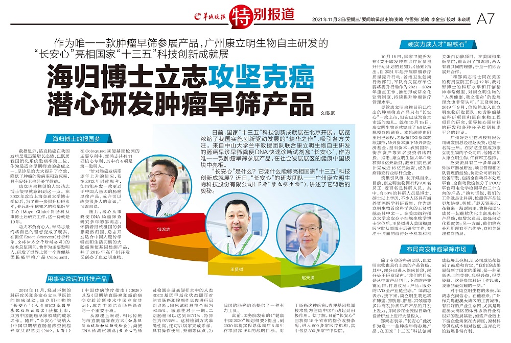 引言:日前,“长安心”产品在“十三五”科技创新成就展亮相,吸引了各界的关注。康立明生物创始人、肠癌早筛技术发明人邹鸿志博士及科学家团队接受媒体记者采访,畅谈科技报国、潜心研发肿瘤早筛产品的心路历程。