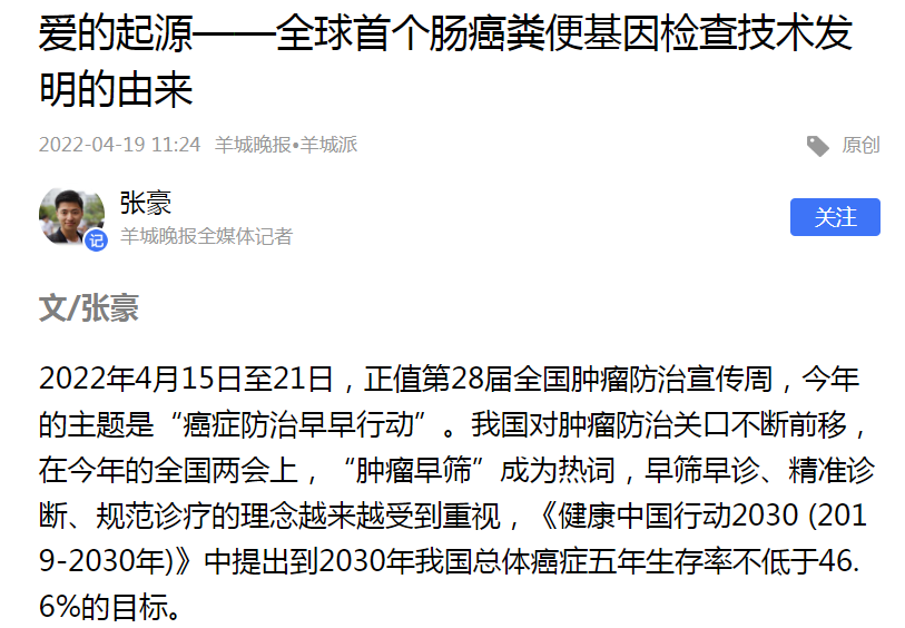 全国肿瘤防治宣传周期间羊城晚报客户端汪建平教授专家访谈、“爱的起源”肠癌早筛技术发明由来等媒体报道,更是聚焦医学人文领域,通过表现科研人员在攻克结直肠癌防治难题的历程,侧面传播结直肠癌早筛知识,让人们认识到新型肠癌早筛技术研发的不易,进一步提升民众的自身肠癌防治科学素养。