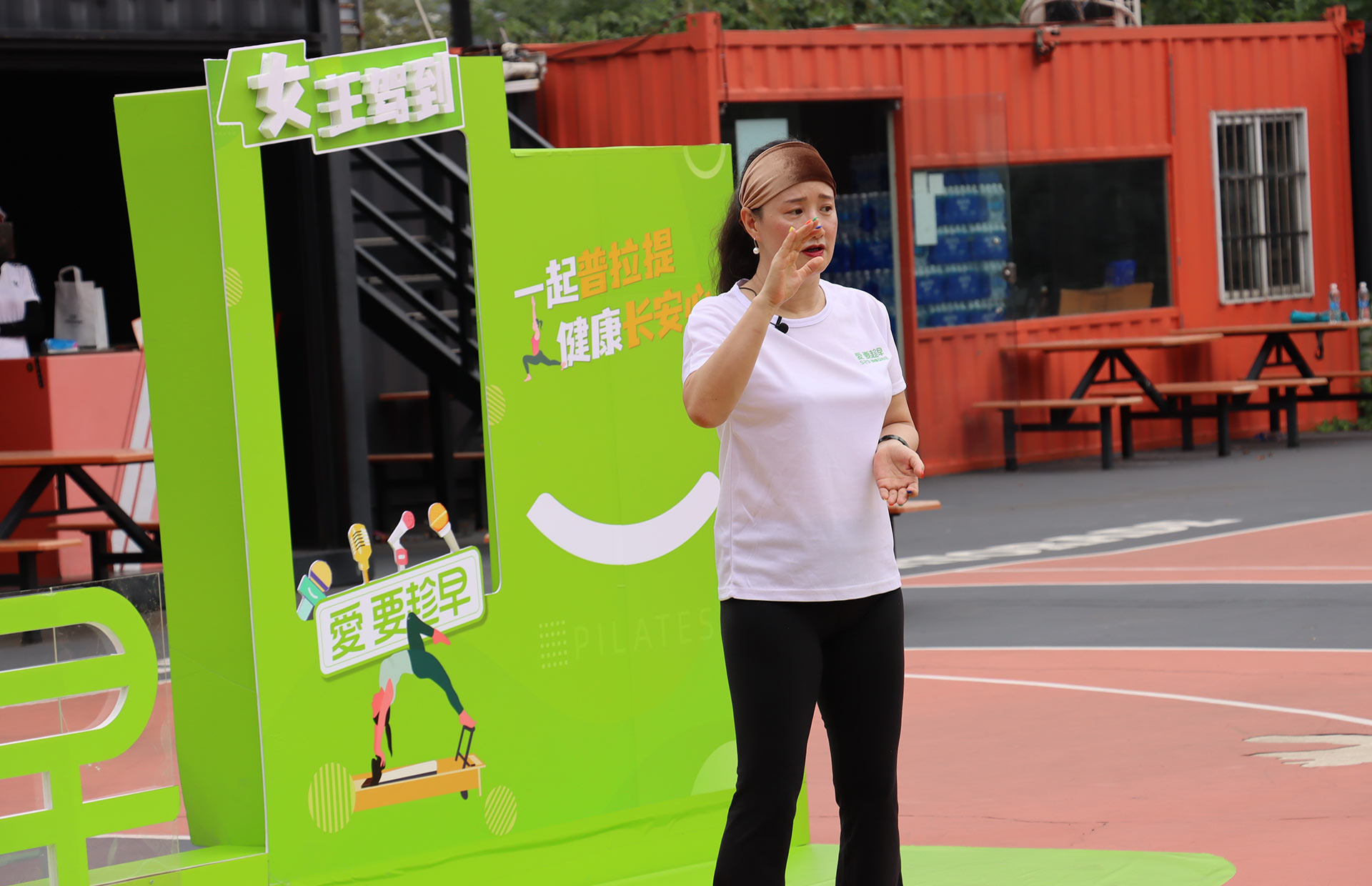 在现场,马老师详细演示、讲解了“肠道普拉提”动作,并带领30多位普拉提爱好者一起展示。
